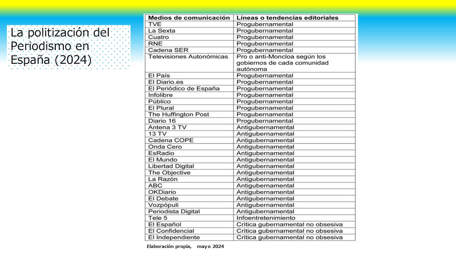 José María Aznar intentó también controlar la TV pública y otros medios. Nos lo explica muy bien José María García en aquella entrevista que le hizo en la misma TVE Jesús Quintero, que fue censurada. La derecha era una ideología desestructurada en lo que a influencia en medios se refiere. Hoy se ha recuperado muy visiblemente, a pesar de todo Sánchez exagera cuando habla de máquina del fango porque su máquina del fango es tanto o más poderosa que la de la derecha, por primera vez en la historia de la actual democracia española.