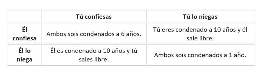 ¿Cooperarán los dos prisioneros para minimizar la pérdida total de libertad o uno de ellos, confiando en la cooperación del otro, lo traicionará para quedar en libertad?