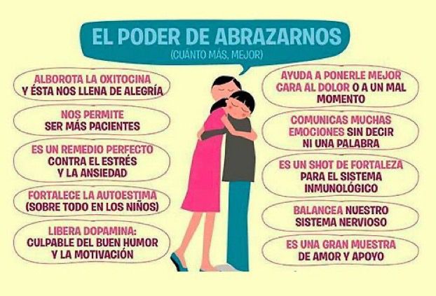 Abrazar es una poderosa manera de dar salud, pues no sólo ayuda a sobrellevar mejor las enfermedades, sino que también ayuda a combatir la soledad, la depresión, la ansiedad y el estrés. Y que nos aportan los abrazos, esos que queremos y no podemos darnos?: