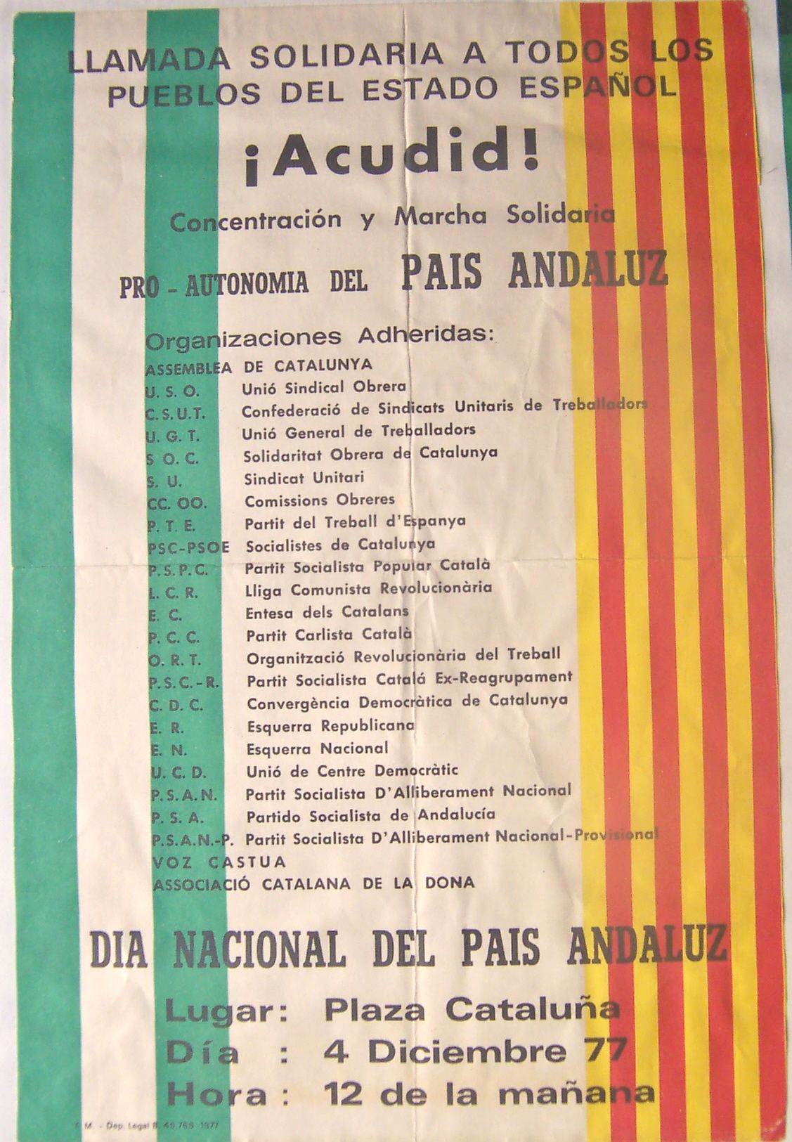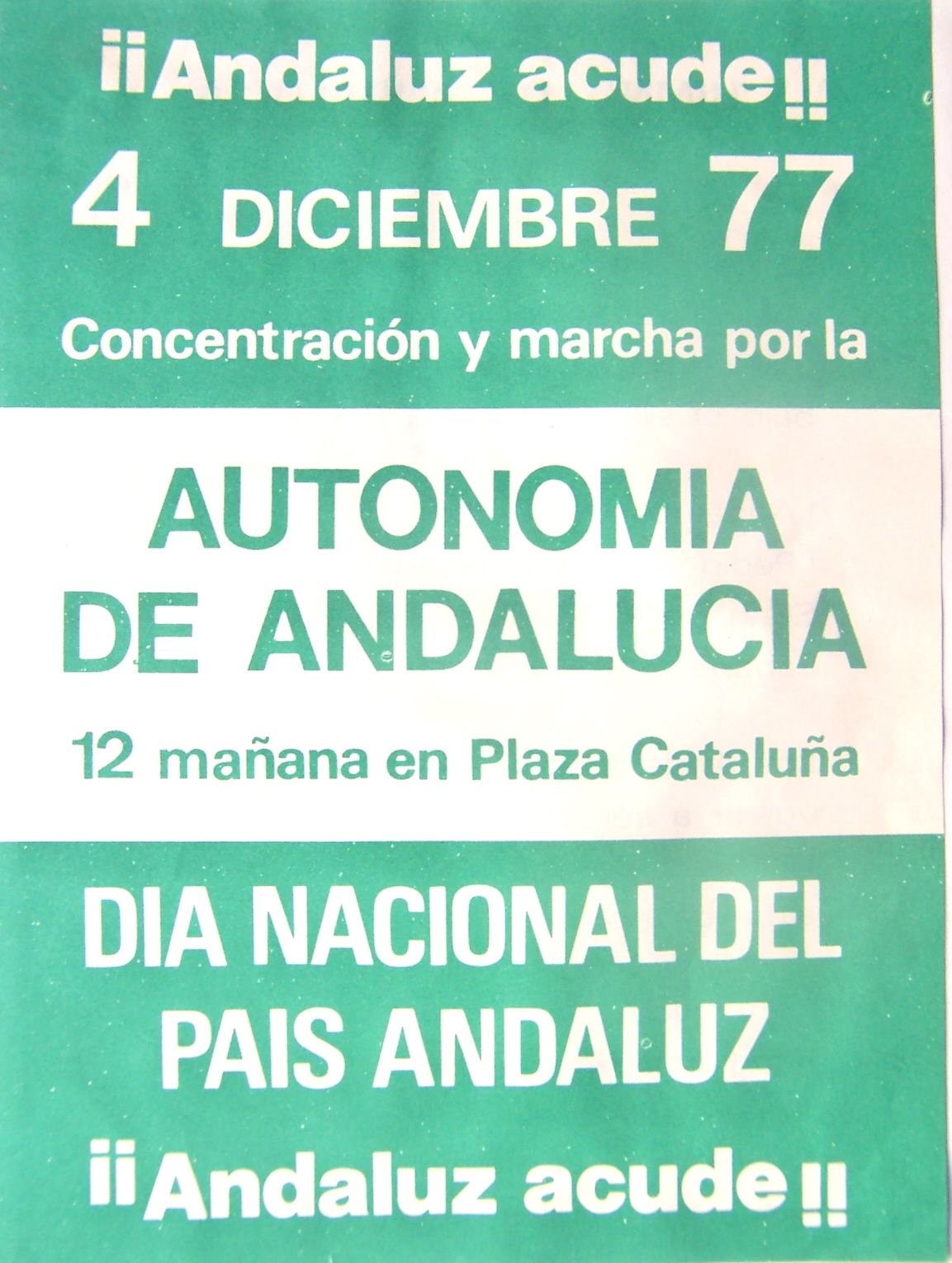 En 1977, la gran mayoría de los partidos políticos de Andalucía habían decidido convocar una manifestación en demanda de Autonomía. Se fijó la fecha del domingo 4 de diciembre para realizarla. Los andalucistas en Cataluña, militantes de la Agrupación de Socialistas Andaluces en Cataluña (ASAC), vinculada al PSA, decidieron impulsar también en Barcelona una gran manifestación en pro de la Autonomía de Andalucía. Estos andalucistas, muchos de ellos integrantes de Asociaciones culturales andaluzas y peñas flamencas, llevaban todo el año haciendo actuaciones a favor de la autonomía andaluza y de dar a conocer entre la amplia colonia andaluza en Cataluña, los símbolos de Andalucía que aprobaron los andalucistas históricos, especialmente la bandera verde blanca y verde. Una de estas acciones fue pasear por el césped del campo del club de fútbol del Español, en Sarrià, una gran bandera andaluza con el lema “Autonomía”, Bandera que poco antes habían descolgado otros andalucistas desde la Giralda de Sevilla.