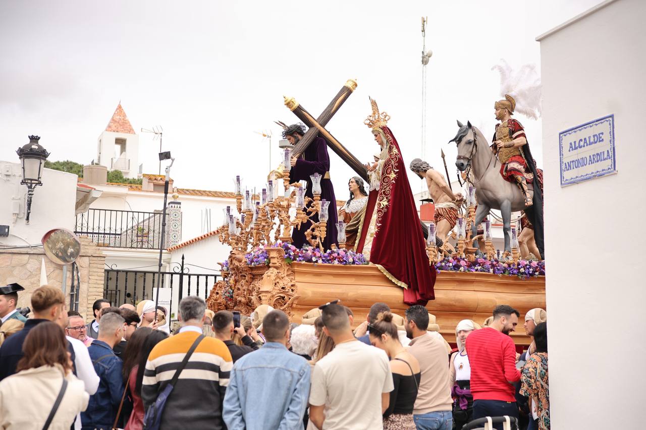 Al filo de las doce y veinte el paso se ponía en la calle, mientras que caía un muy leve chispeo. La primera levantá fue dedicada al portero del colegio de la localidad. Desde ese momento, a la cofradía le quedan por delante alrededor de 14 horas y unos 13 kilómetros de presencia en las calles. La música tras el paso llega desde Martos de Jaén, pero a quien se espera con ganas es la incorporación del Rosario de Cádiz que lo hará desde la plaza del Caballo.