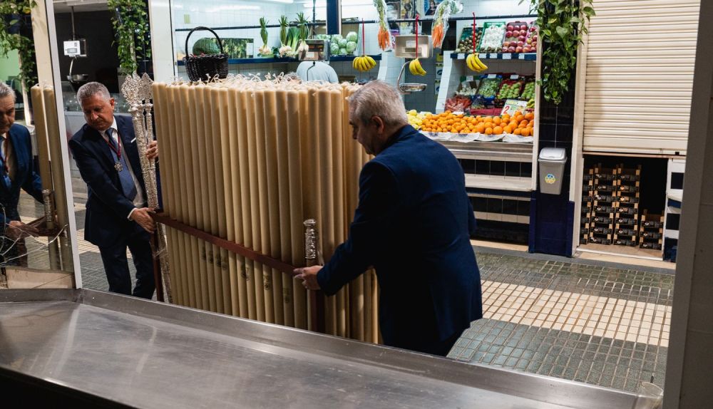 El aroma de que es un día distinto se huele y se ve. Personal de la Hermandad cuelga carteles en las columnas que habitualmente están destinadas a las ofertas. Esta vez no se lee ninguna. Son avisos sobre los diferentes tramos y dónde deben colocarse cada uno de ellos. Al lado de una de las fruterías ya están los cirios preparados para la salida procesional.