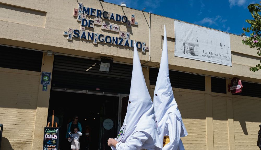Donde no se nota la falta de gente es en el bar de Curro. Su pizarra con la oferta del 'supertieso' da la bienvenida. En breve la leerán un porcentaje considerable de los 3.000 nazarenos que este año San Gonzalo pone en la calle. "El mercado funciona poco. Los fruteros empiezan a recoger antes", reconoce. No obstante, "yo me quedo para que los chiquillos tengan algo para beber". Las miradas van al cielo, pero Curro es optimista. "Yo creo que no va a haber problema", dice recordando los retrasos del pasado año que tuvieron final feliz. Israel es de la Macarena, pero vive en San Jacinto y apunta, "dan agua a partir de las 22 horas".