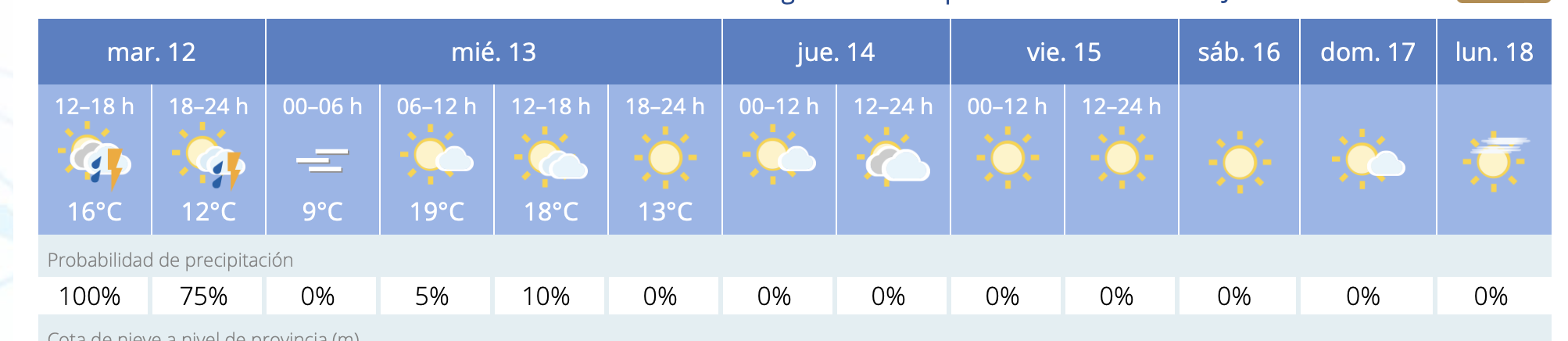 La meteorología para hoy sigue anunciando lluvias principalmente en el tramo de mañana y tarde. La AEMET, en su pronóstico publicado hoy, predice un riesgo del 100% de lluvias hasta alas 18 horas; después baja al 75 % hasta la medianoche en la que el riesgo desaparece.