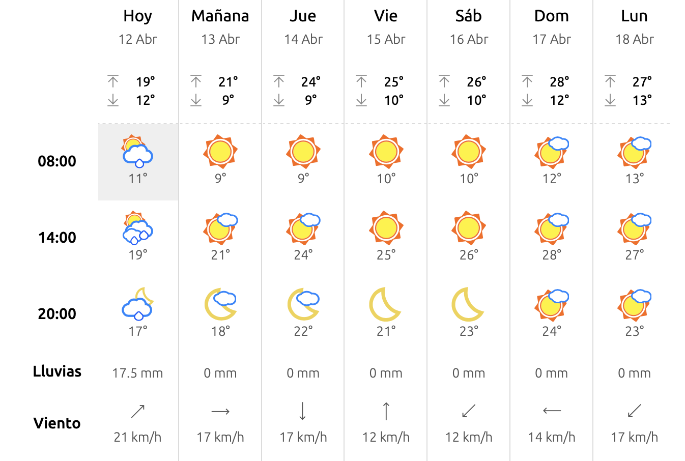 El tiempo.es vaticina lluvias hasta las 20 horas, más o menos intensas especialmente por la tarde con un acumulado de 17 litros por metro cuadrado.
