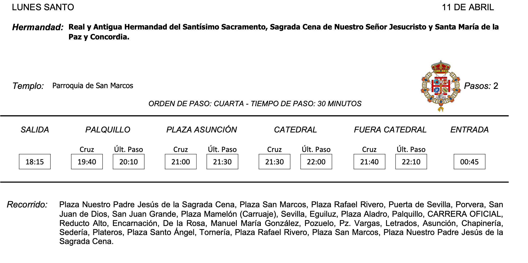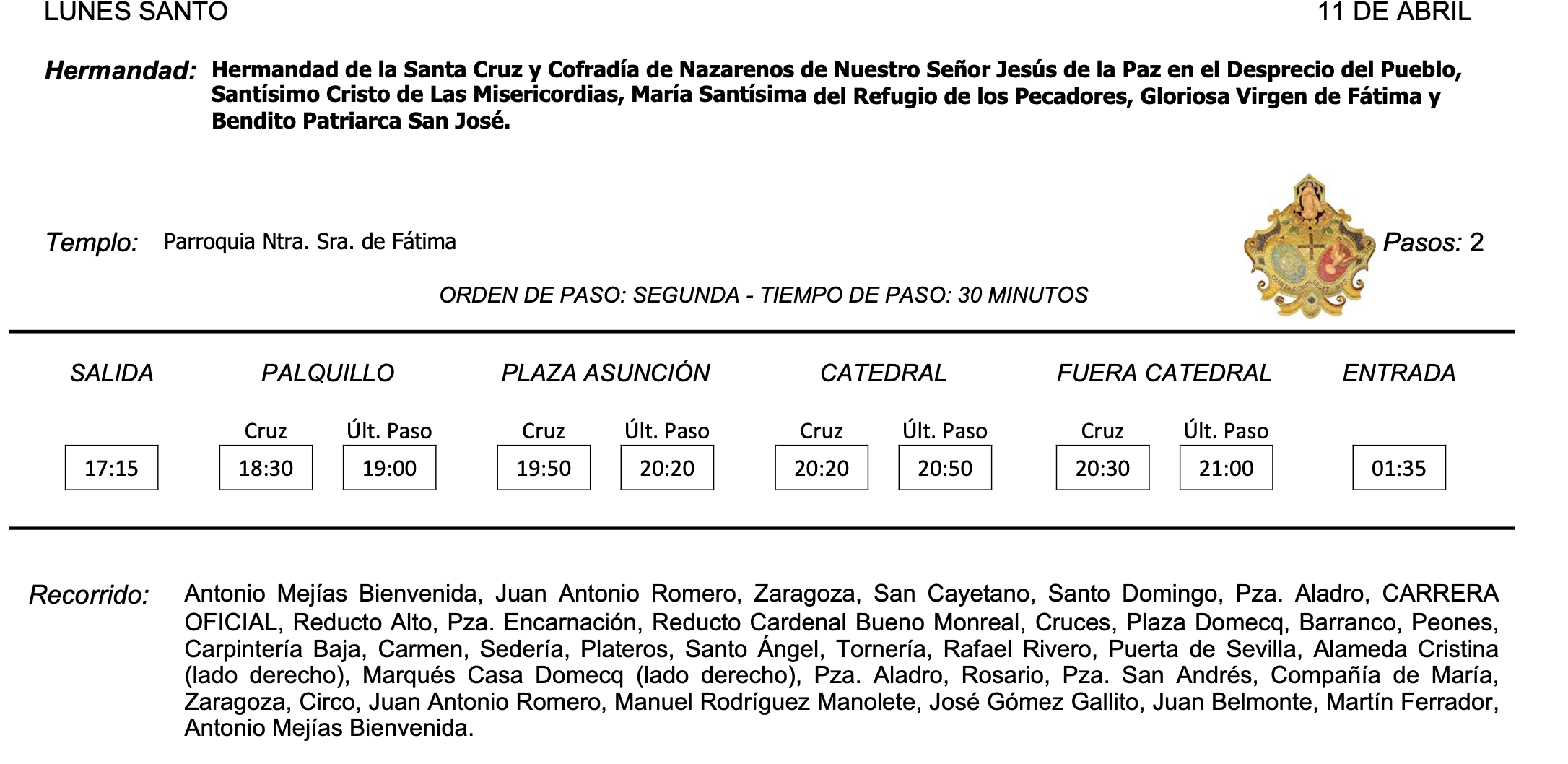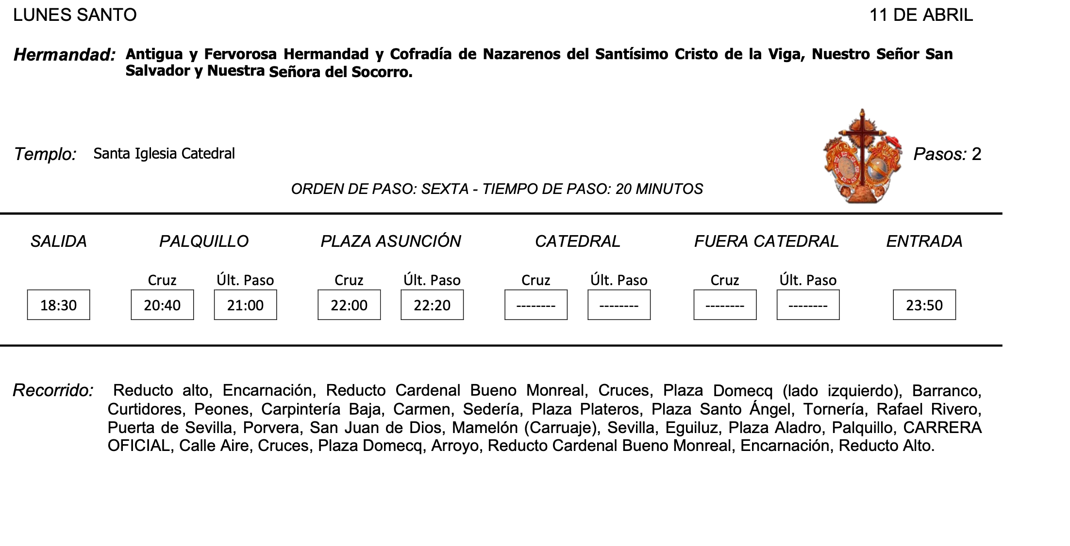 Cambio en su itinerario: una vez salga de la Catedral no bajará hacia el Arroyo. Subirá por Hortas Cáliz a la Alameda Vieja para buscar la iglesia de San Miguel, recuperando el recorrido antiguo que llevará a la cofradía hasta las puertas del templo en el que fue erigida como hermandad en enero de 2013 y donde fue bendecido el crucificado de la Sed. Esta año sale terminada la talla del frontal del canasto del paso que sigue ejecuta ando el jerezano David Medina.