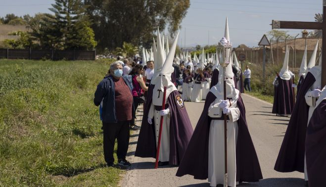 Con un sol espléndido luciendo en un cielo celeste y una temperatura más que agradable, por las calles de Guadalcacín se vivieron los primeros momentos cofrades normalizados. El uso de mascarillas fue desigual, pese a las recomendaciones de usarlas en las bullas. Pero todo eran sonrisas y caras de felicidad; de estar disfrutando y de no querer pensar en negativo. La cofradía gaudalqueña, una vez salió de la población, enfiló el camino -carretera- de Espera que desemboca en San José Obrero y desde ese punto volver a tomar contacto con lo urbano con las zonas residenciales de Jerez.