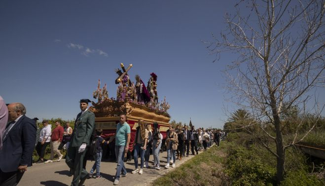 Nos situamos en el Sábado de Pasión, el día de vísperas con solo dos hermandades en la calle. Las dos de carácter e impronta totalmente diferentes; las dos desparejas en cuanto a horarios e itinerarios por lo que hubo que ir a buscarlas. Mejor que pegarse caminatas, la gente prefirió esperarlas en el centro urbano -con toda la Carrera Oficial montada-; la excepción, desde mucho antes de las 12,30 horas en la que se produjo la salida de la Hermandad de la Entrega de Guadalcacín. La población literalmente se desbordó de público. Incluso para acceder a la pedanía hubo retenciones de coches intentando llegar y buscar aparcamiento donde fuera.