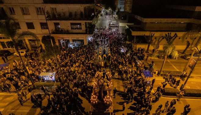 Dejó atrás el centro urbano y entró en escena la otra cara de la moneda cofrade de las vísperas, la Hermandad de la Mortaja. Nazarenos de negro, silencio, severa música de capilla, rigurosa penitencia, un recorrido corto, un paso de enorme estética y sólo unos 70 nazarenos. Tal vez en este último dato se ve el lado negativo de esta hermandad ayer. Muy corta; parece que el efecto llamada tras dos años sin salir a la calle no ha tenido el impacto merecido en esta cofradía.