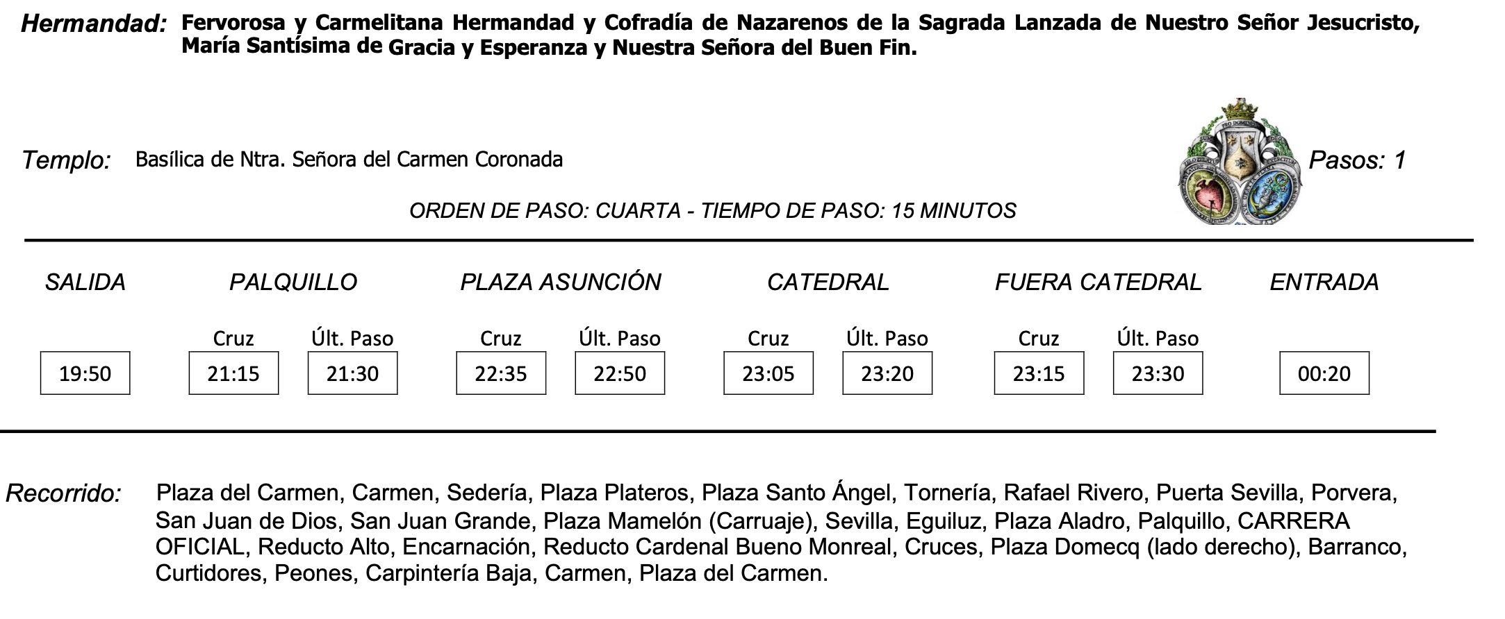 Estrena su paso por la nueva calle Santa Cruz, tras San Juan de los Caballeros. También es novedad el bordado completo de los faldones del palio, obra de Calderón