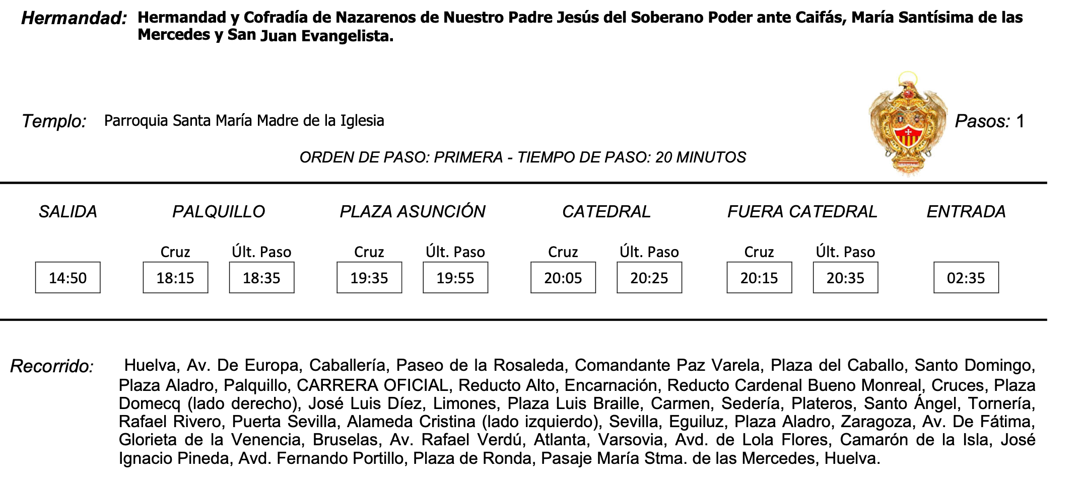 Saldrá de Las Viñas y visitará a las Hermanas de la Cruz en su regreso. Estrena parte de los bordados del palio y la confección en terciopelo de caídas, techo y faldones; la delantera se presentará bordada para lo que se ha usado piezas antiguas del siglo XIX.