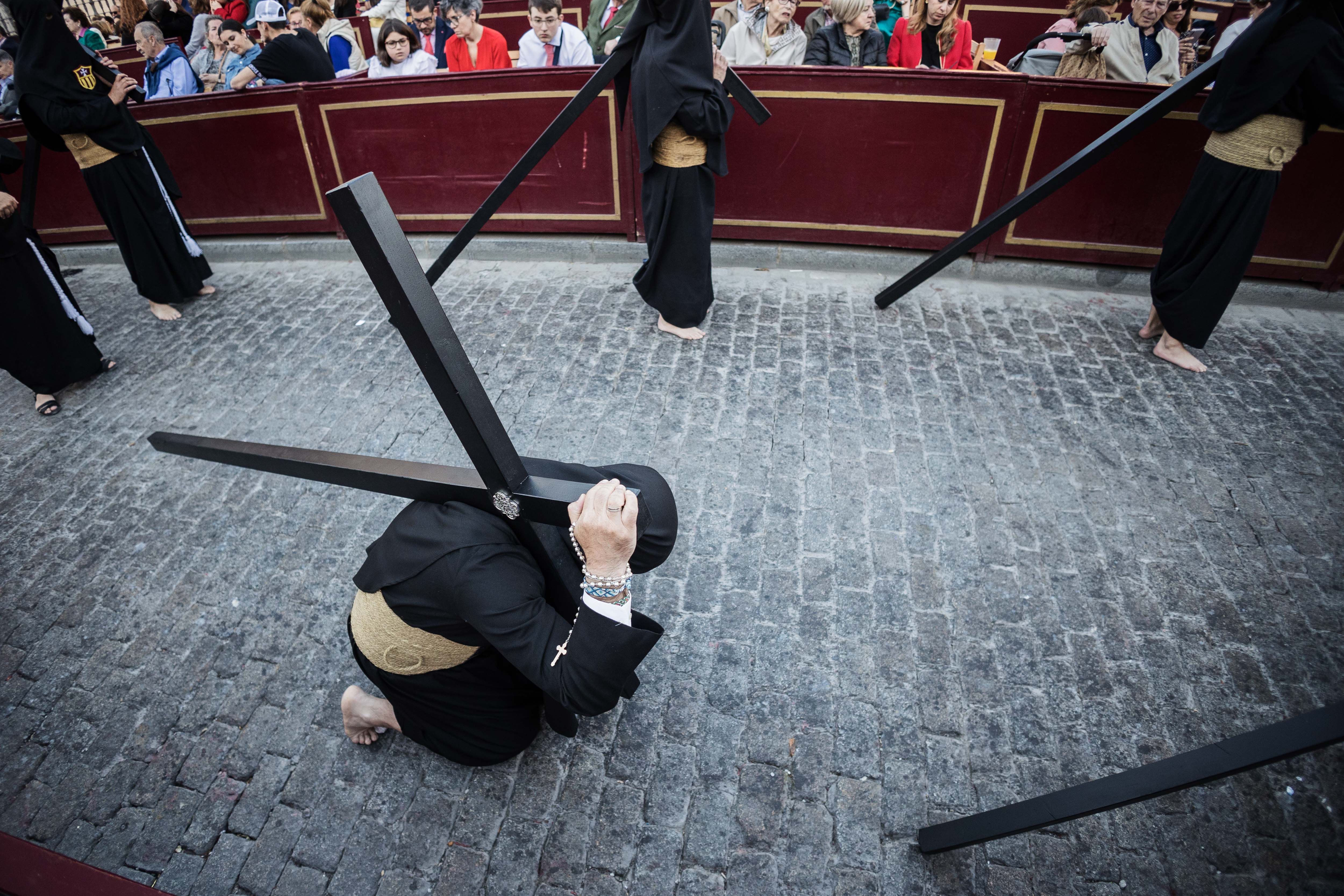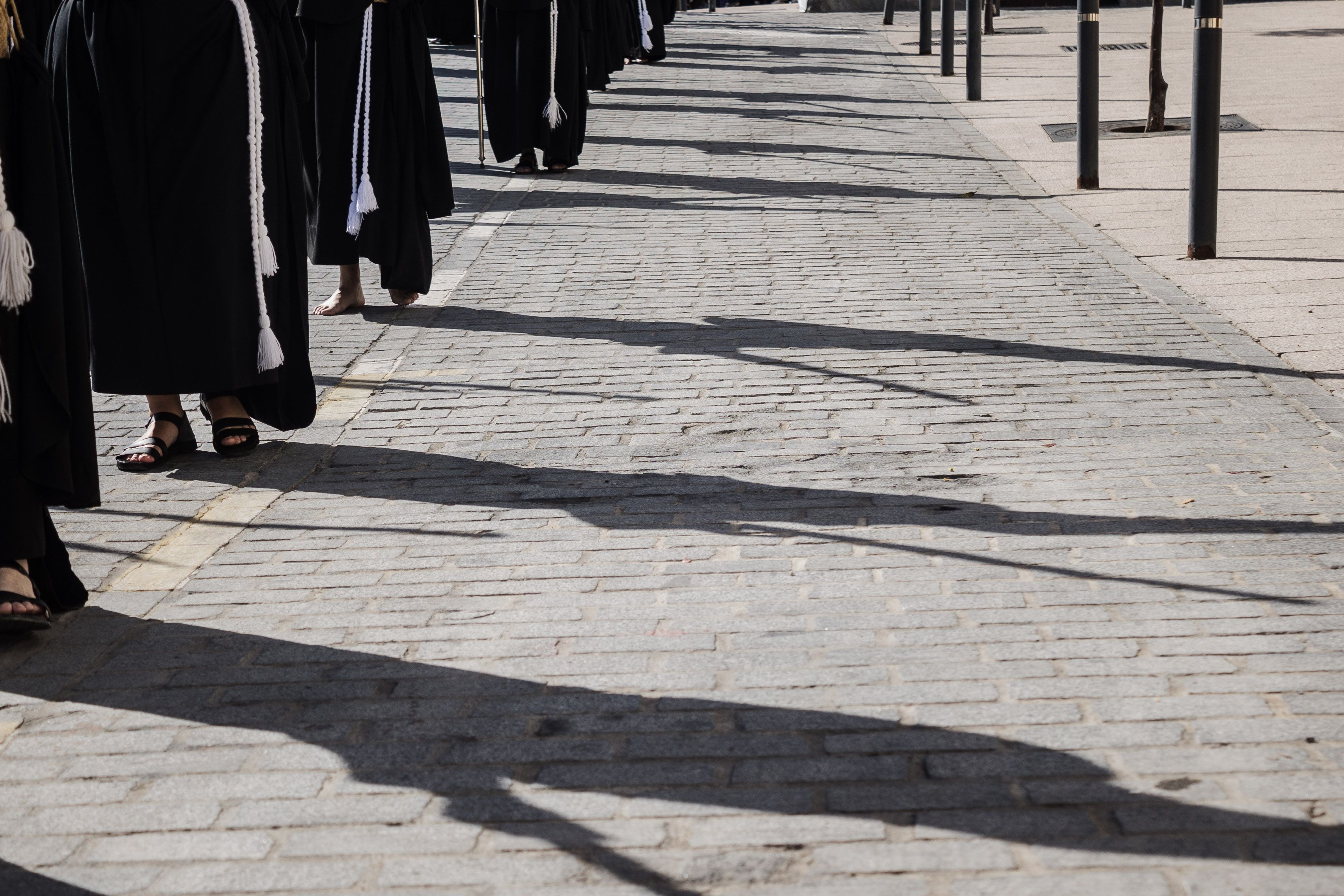 Cortejo de nazarenos de la Hermandad de las Tres Caídas.