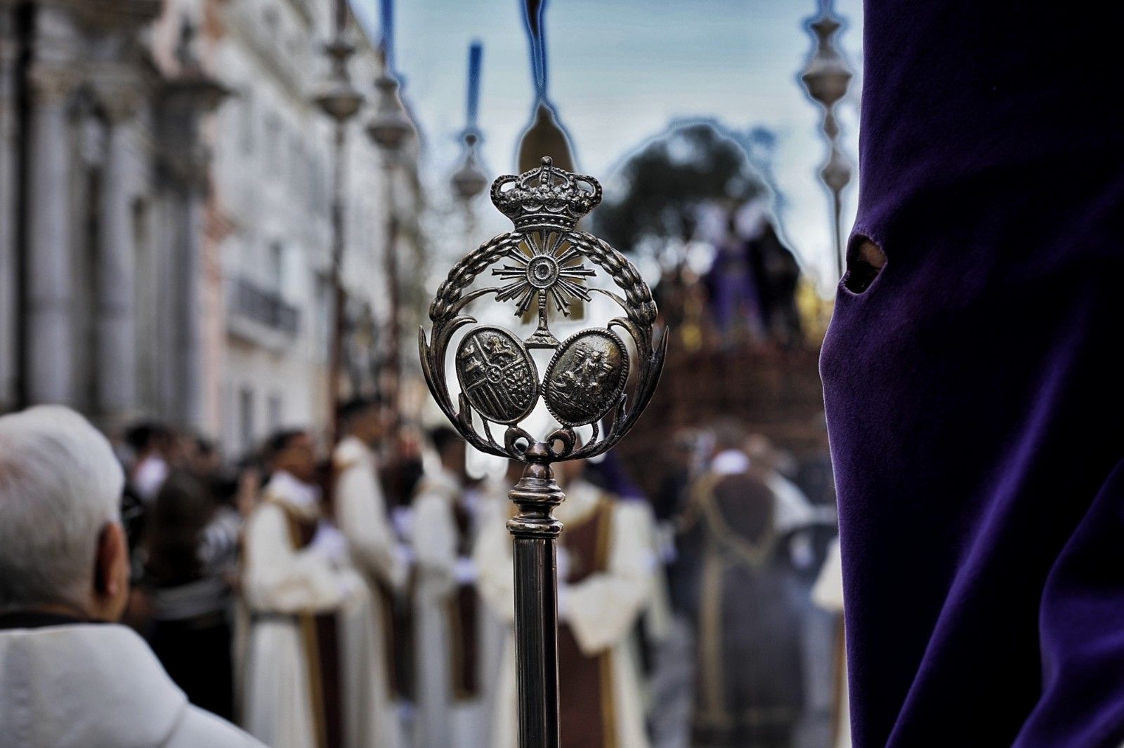 Un maniguetero con su vara marcando el ritmo en el caminar de una paso en Cádiz.
