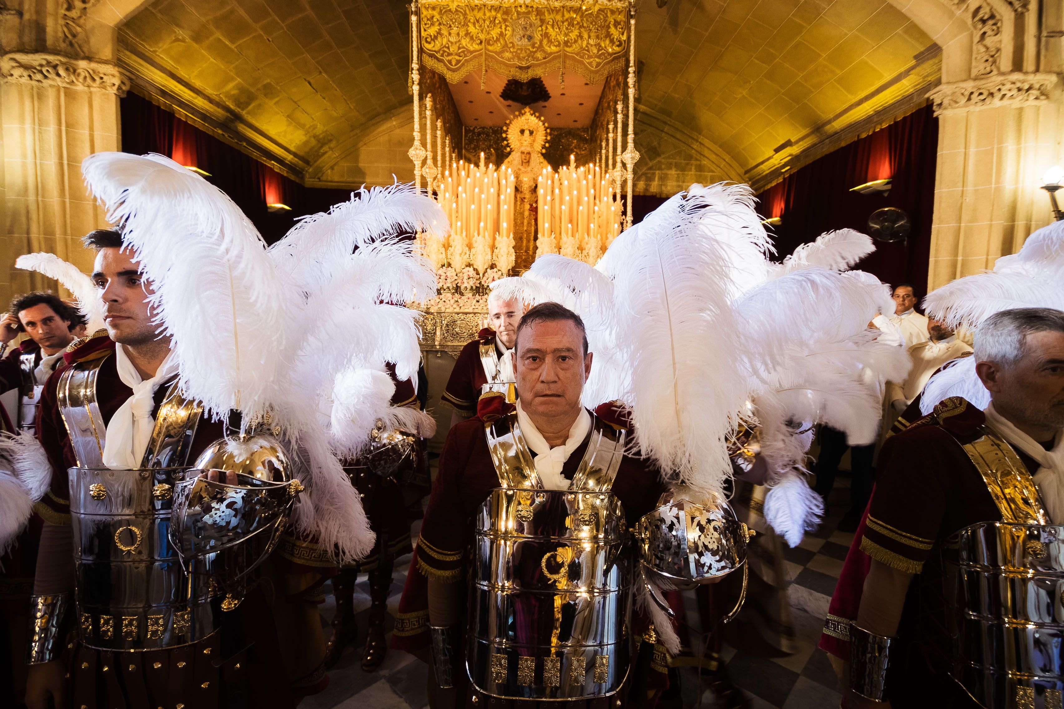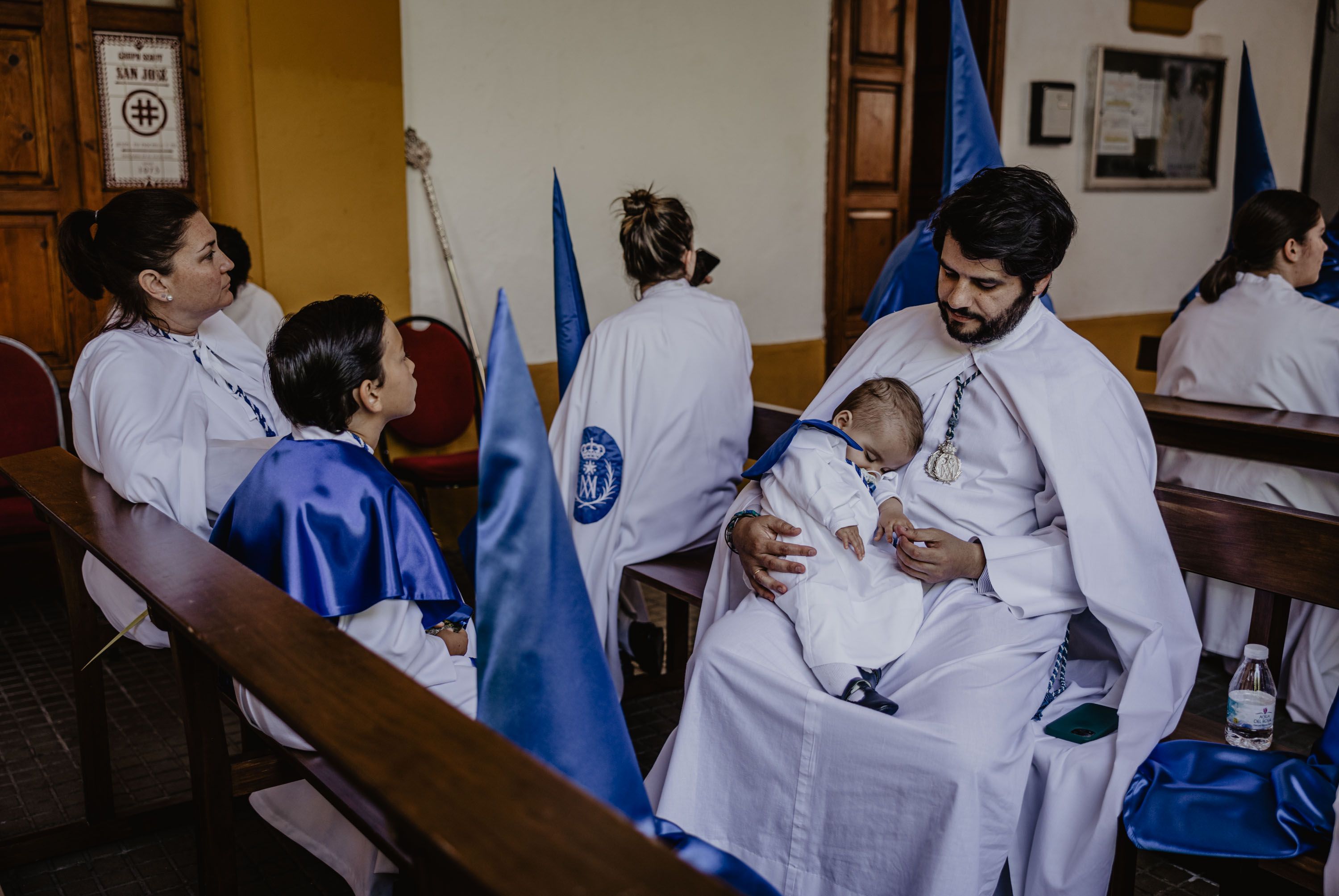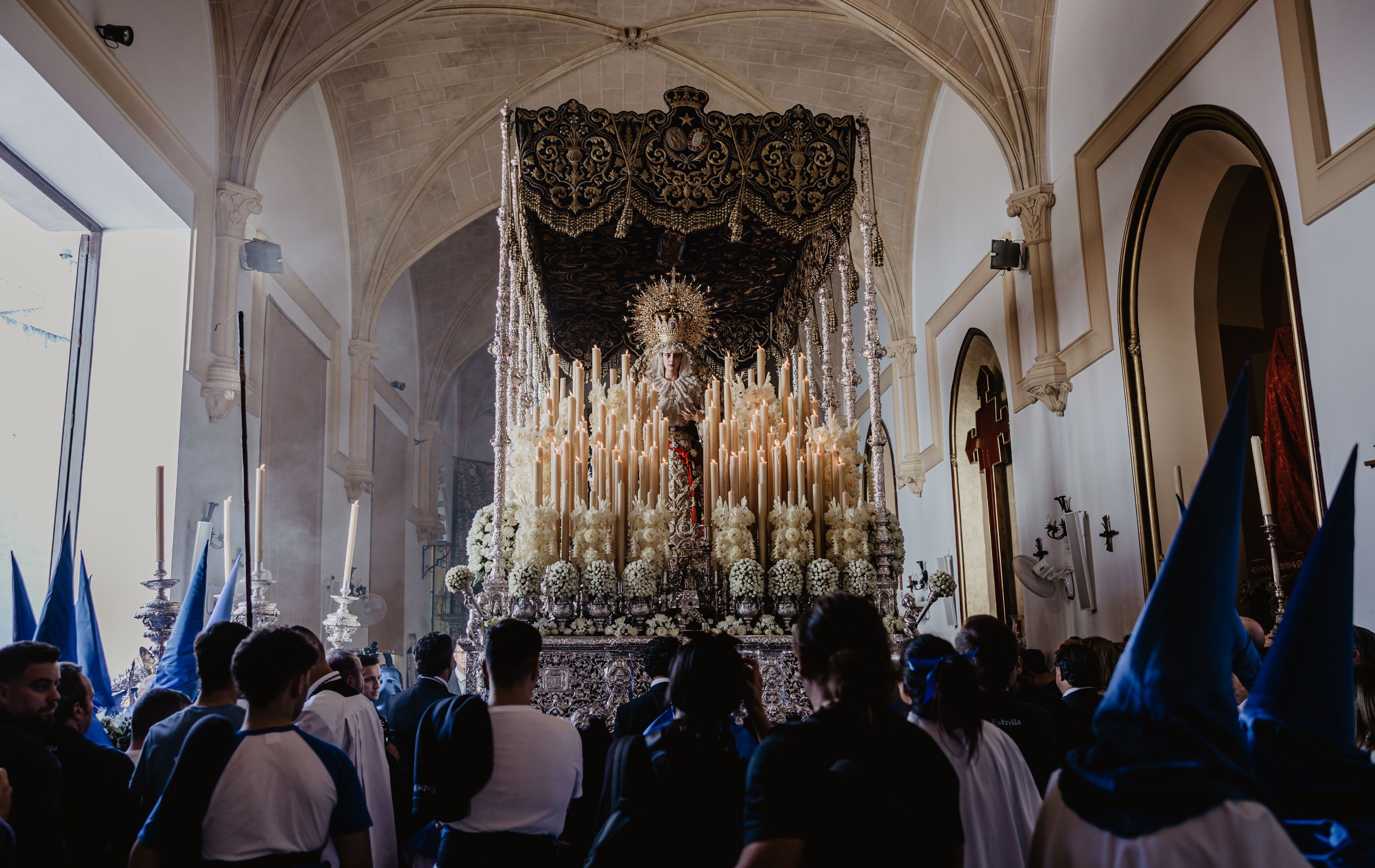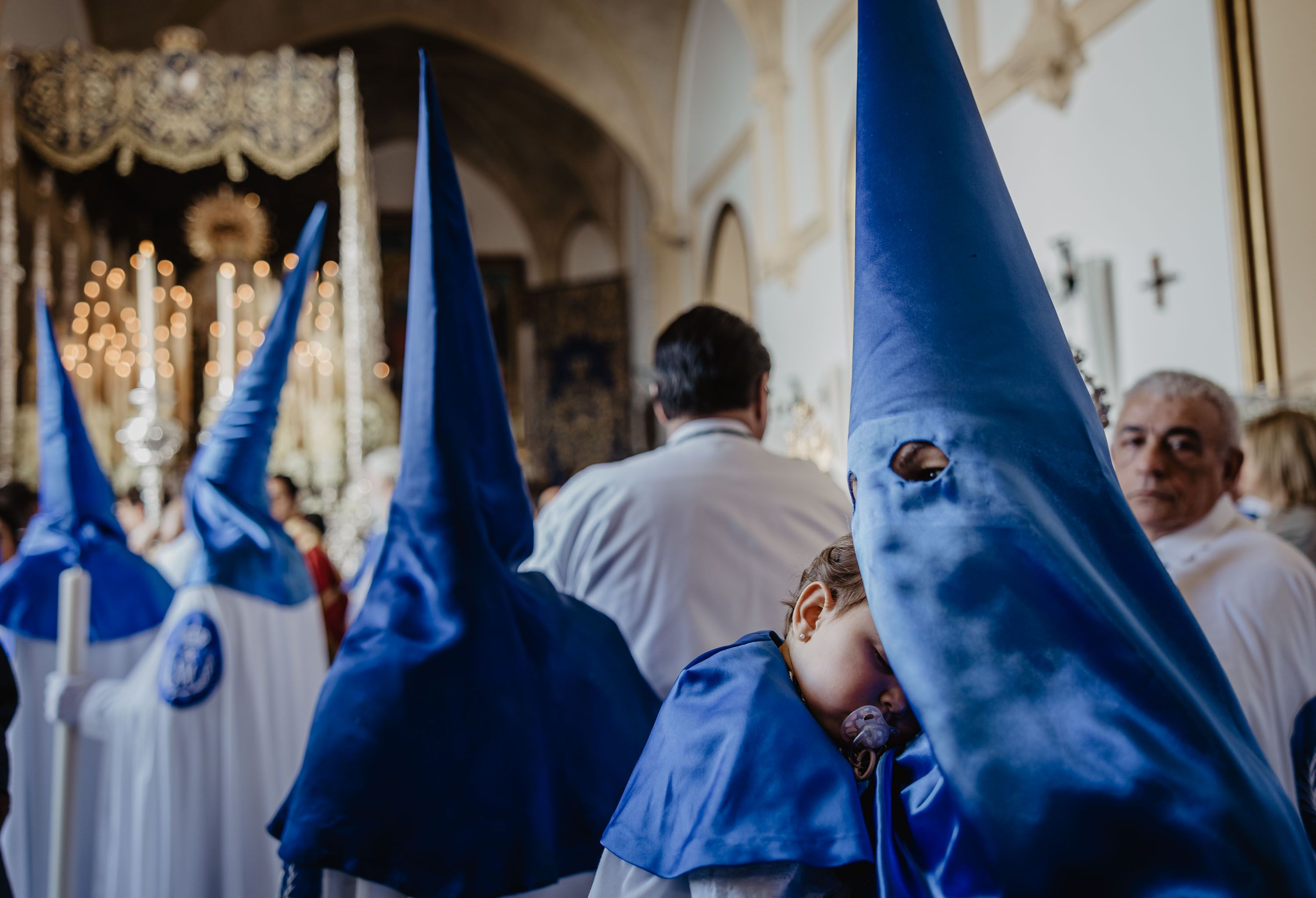 Una hermandad con historia y largo recorrido en la vida cofrade local. Santo y seña de la pureza en las calles. Todo para exponer en procesión a la Dolorosa del Humilladero, la Piedad, la Virgen con Cristo muerto en su regazo sobre un jardín rojo sangre de toro y de voces blancas que van anunciando su llegada. Es la música de Las Angustias. Sin más. Con ese contrapunto de negros y silencios se recoge el Domingo de Ramos.