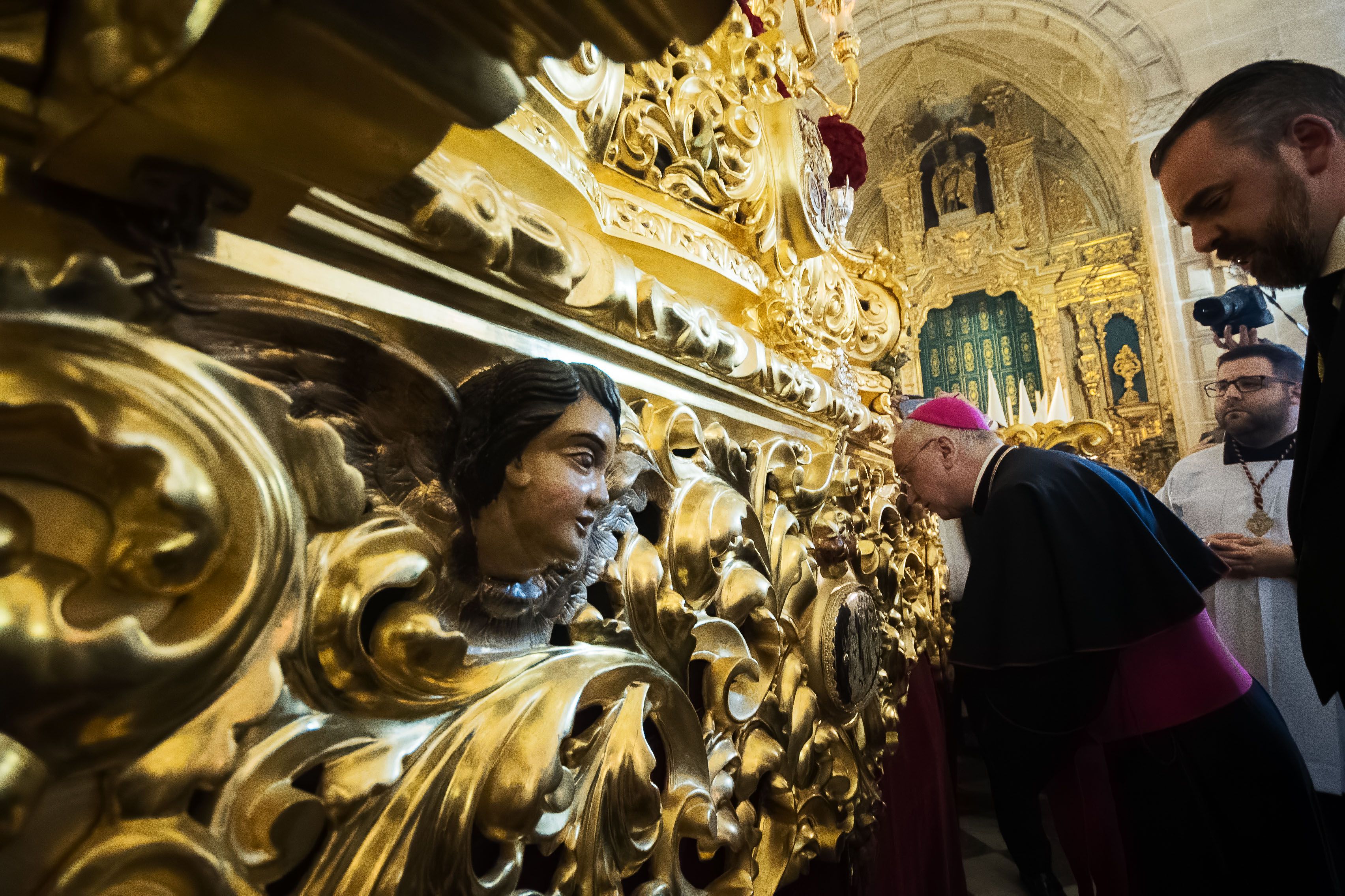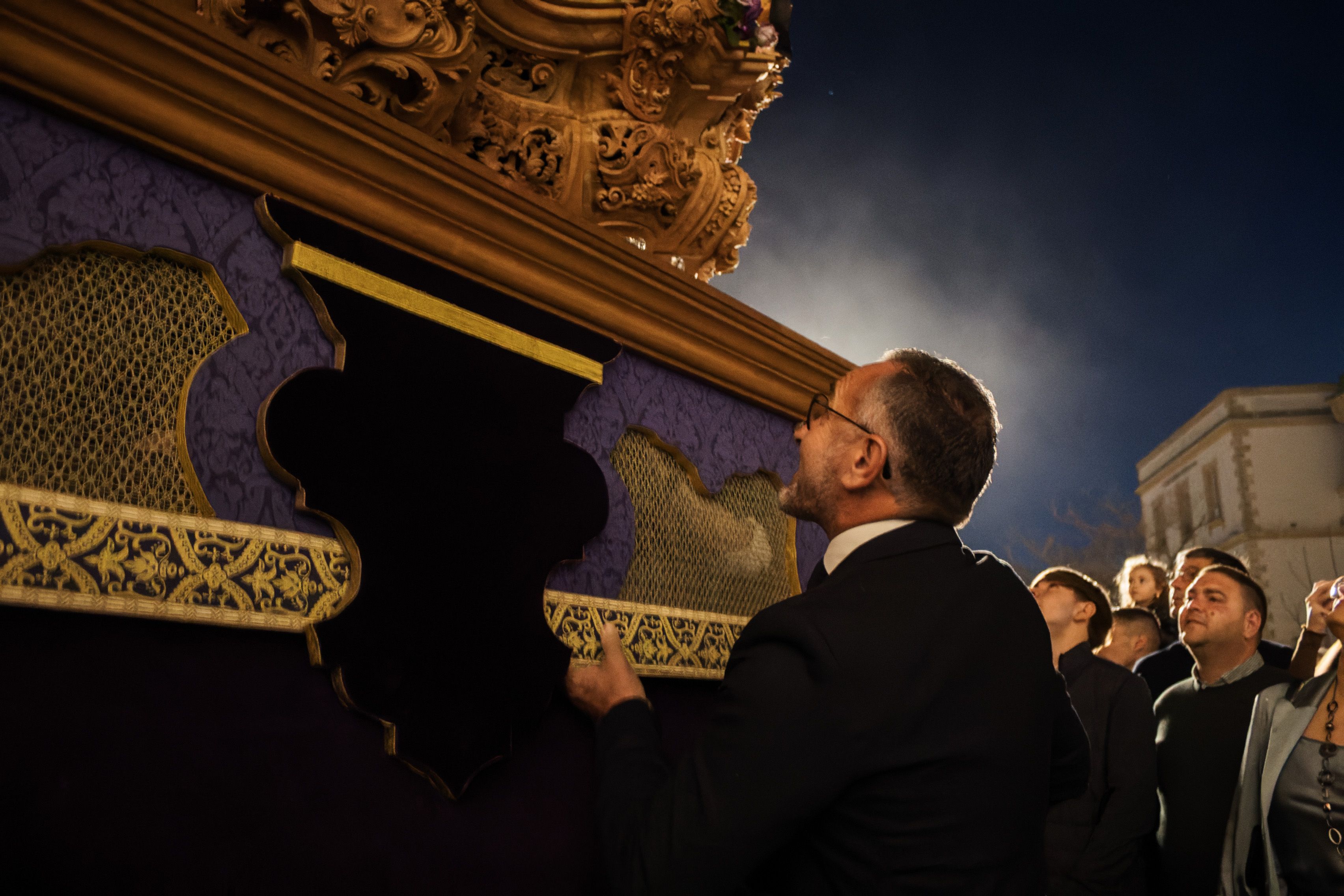 El paso de palio de La Paz saliendo de la capilla de los Desamparados.