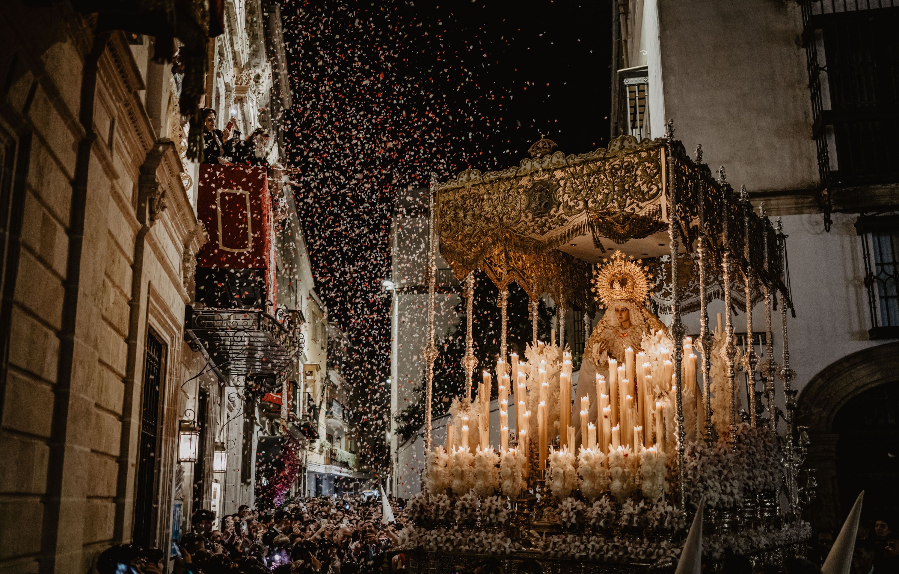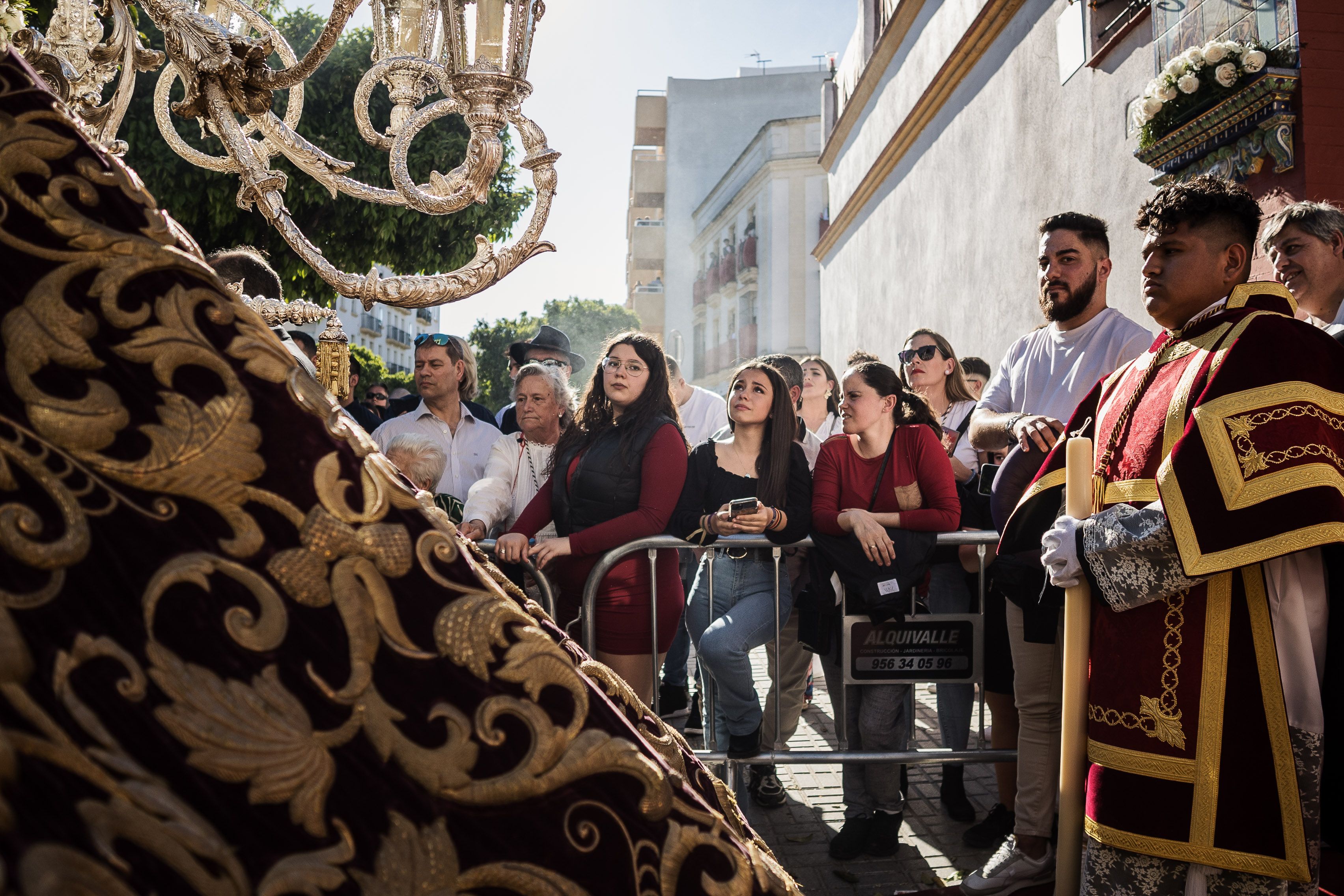 Una petalada a la Madre de Dios de la Misericordia, de la Hermandad del Transporte, un Domingo de Ramos en Jerez.