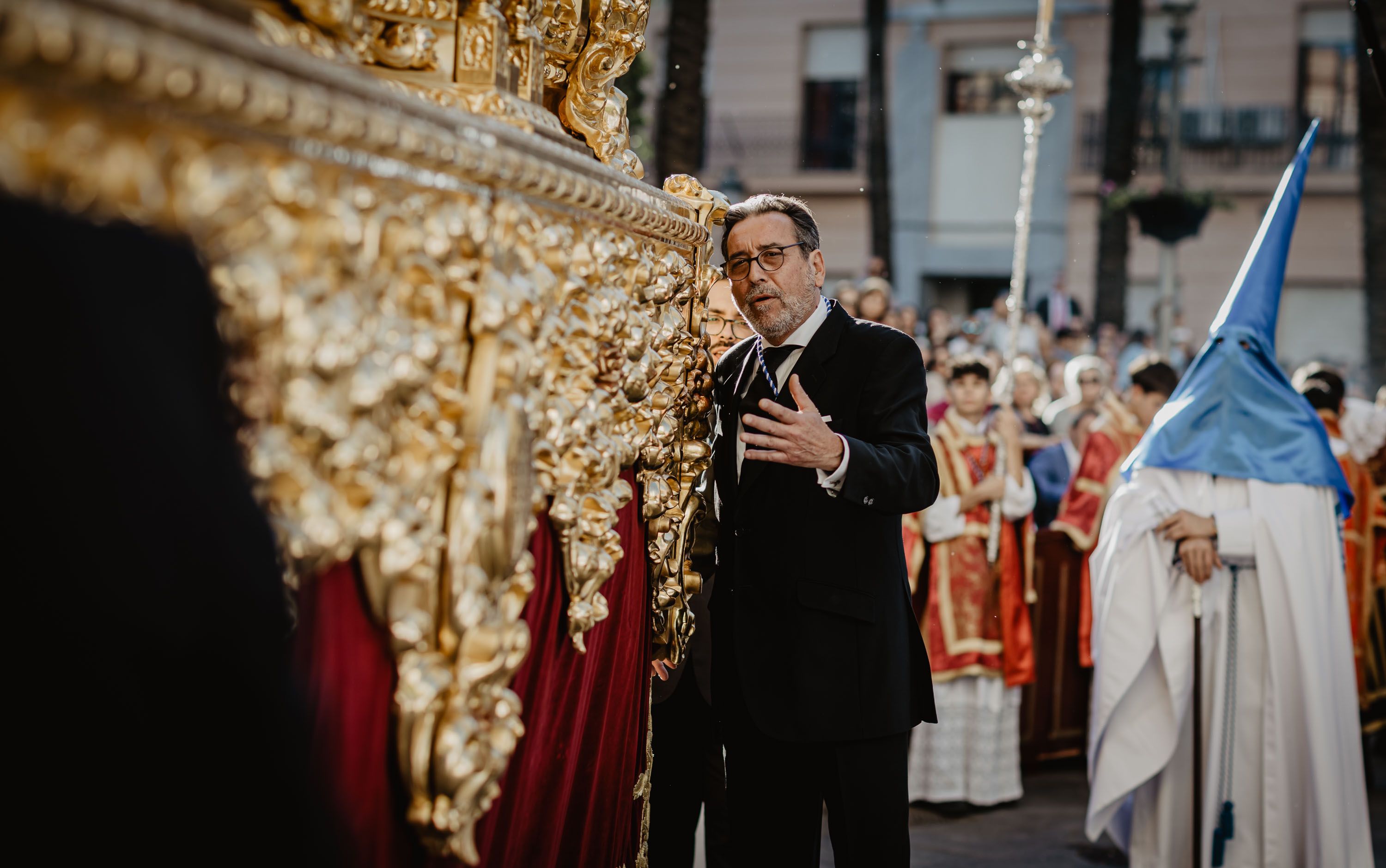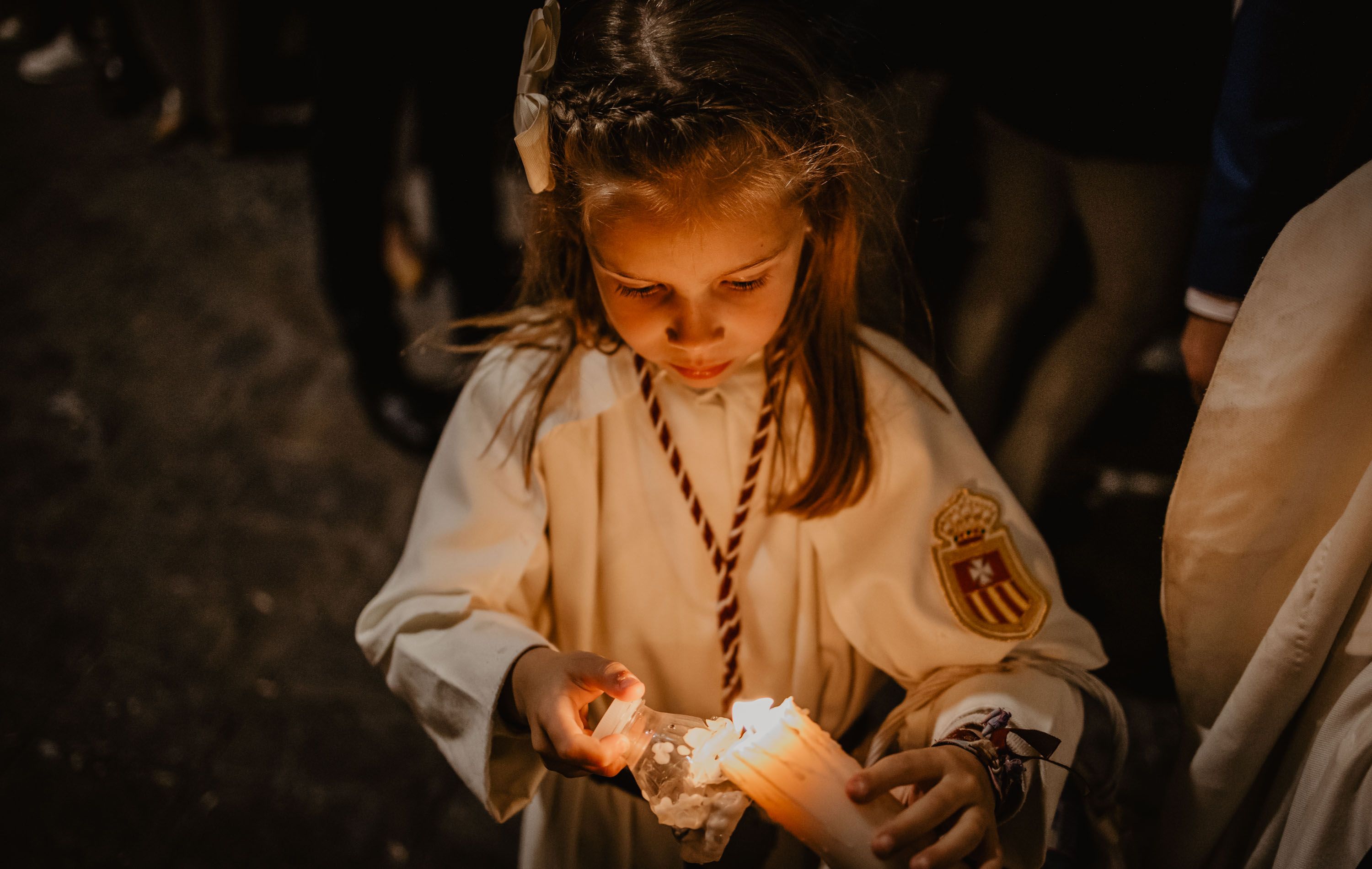El vientecillo que se levantó a la caída de la tarde mató a las candelerías. Una pena verla apagada en el palio de La Paz que no dejó ver los brillos y la riqueza interior de unos bordados y orfebrería de antiguo cuño. De la época dorada de Elena Caro. Al menos la cera más alta se pudo mantener encendida para derramar una tenue luz en el rostro de la Dolorosa de los Desamparados.