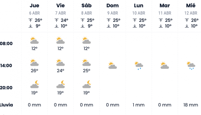 El popular portal El Tiempo pronostica una situación muy similar en su predicción de este jueves pero no informa de la posibilidad de lluvias hasta el lunes después de Semana Santa. Sí se producirá un aumento de la nubosidad a partir del Jueves Santo.