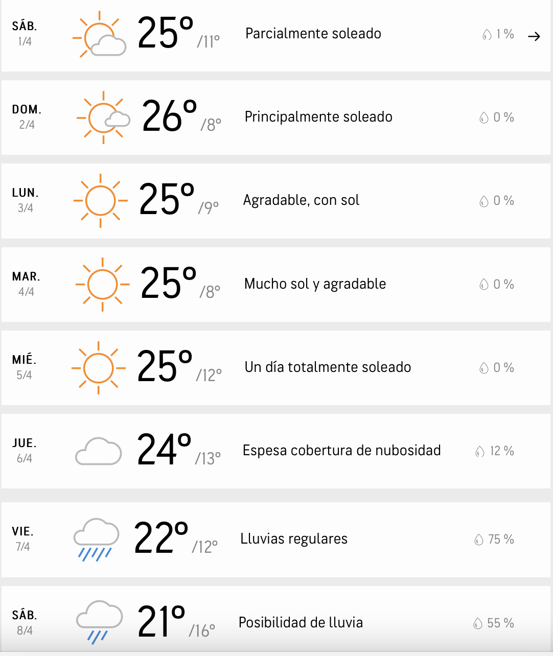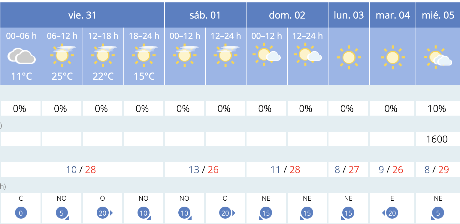 Otro portal, accuweather.com, avanza buen tiempo hasta el miércoles y nubosidad abundante el jueves con un riesgo de lluvias del 12%. El viernes y sábado, posibilidad de ,lluvias en un 75% y un 55% respectivamente.