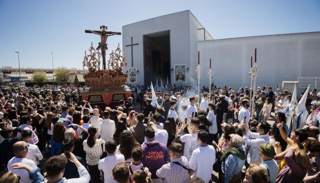 El Lunes Santo fue de faldones levantados para aliviar el calor bajo los pasos, sobre todo las más tempraneras como La Sed que puso la distancia en el día con una salida de ocho horas y media. El crucificado de esta hermandad es más protagonista en 2023 por formar parte del cartel oficial.