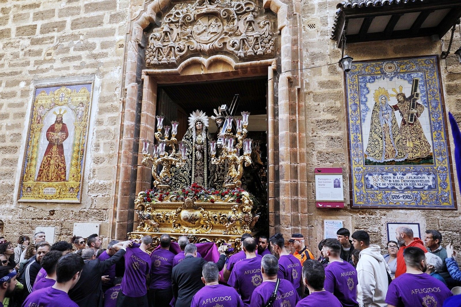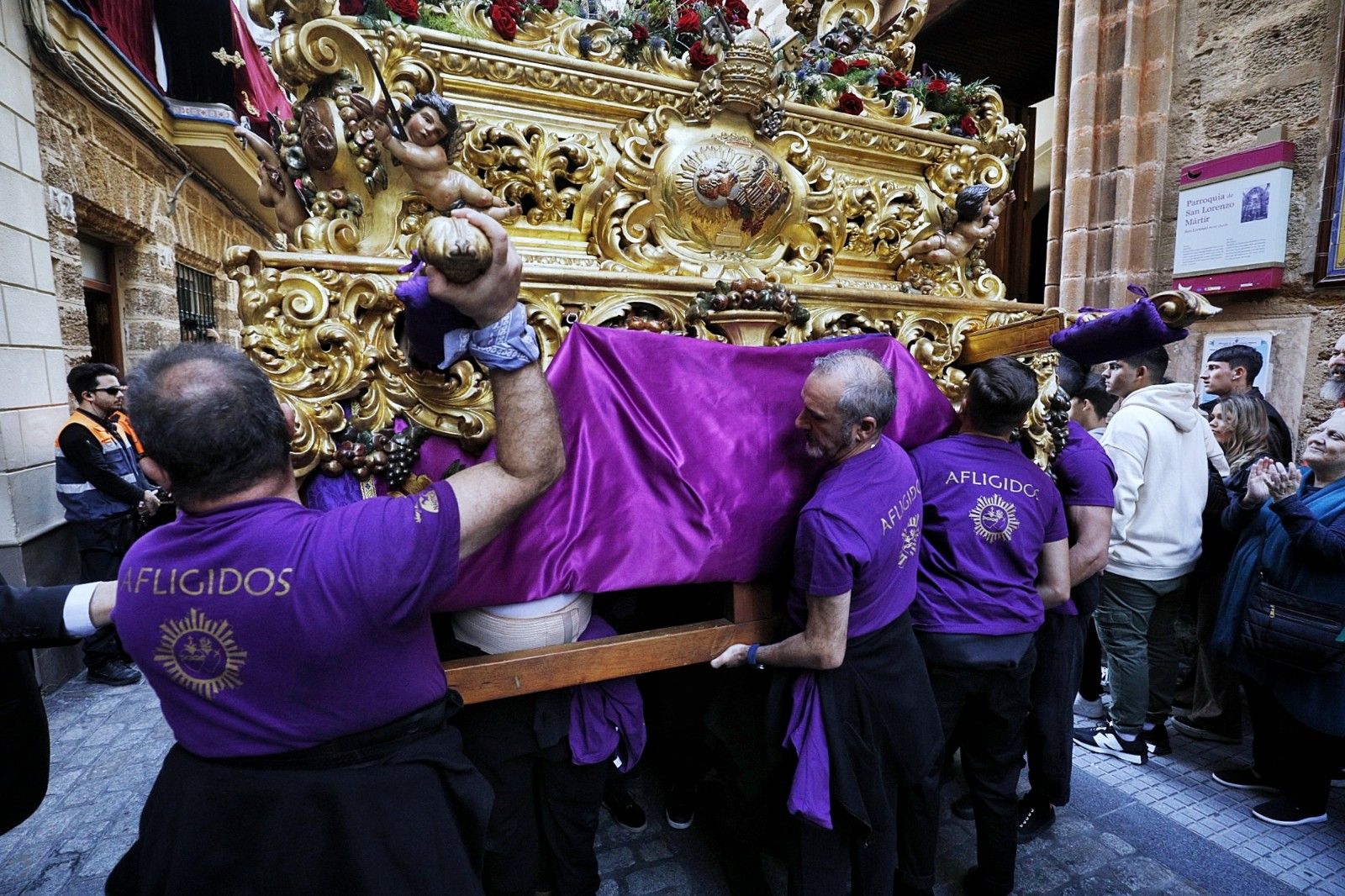 Este Jueves Cádiz también ha brindado una calurosa acogida a la hermandad de los Afligidos, la primera que ha salido, las 19.00 horas desde San Lorenzo y al Nazareno, que ha sido la segunda en entrar en Carrera Oficial tras salir de la Iglesia de Santa María.