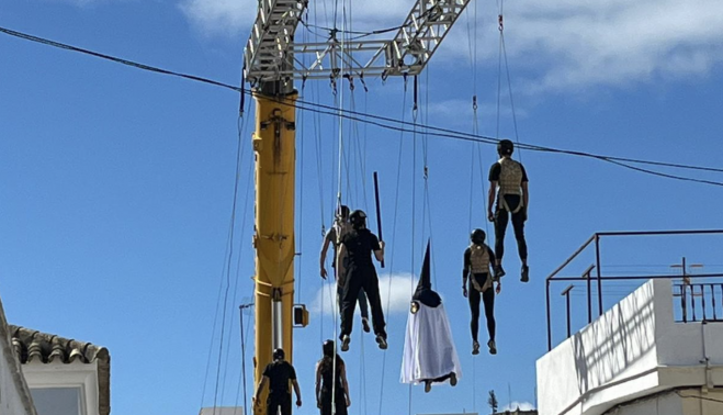 El misterio de esta llamativa estampa está en la pequeña pantalla, y es que en Morón se está rodando la serie de HBO, Cuando nadie nos ve. La ficción trata sobre una investigación criminal, donde se abordan extraños sucesos y un suicidio, que está ambientada en la Semana Santa del citado municipio.