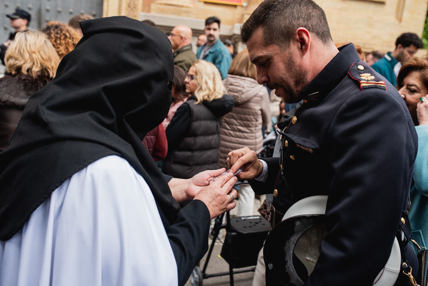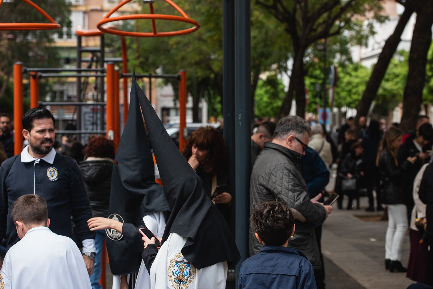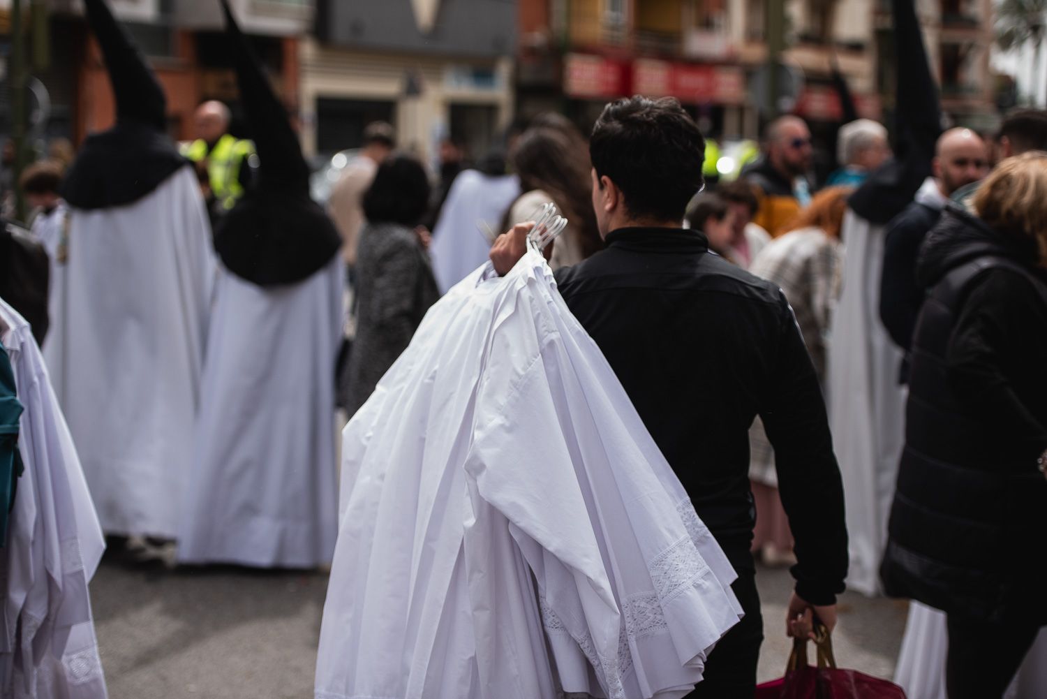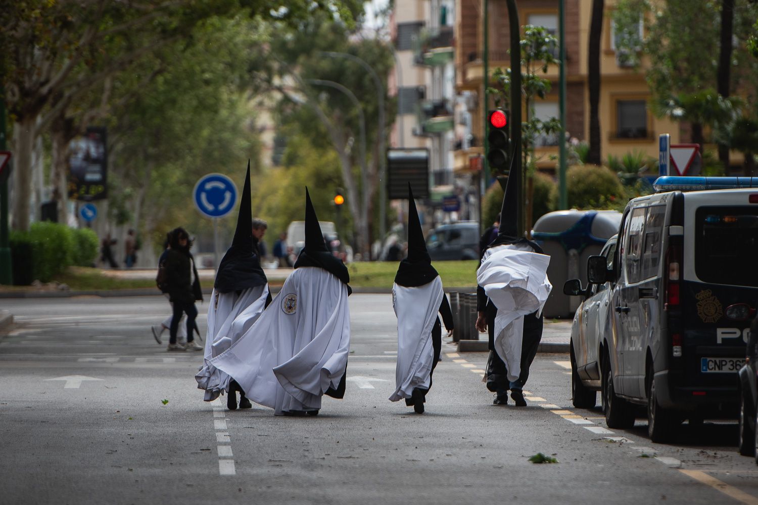 Desde el Omnium Sanctorum los nazarenos del Carmen han puesto camino al centro después de celebrar de forma efusiva la decisión de la Junta de salir a las calles y formar el cortejo en tiempo récord. No obstante, el misterio del Señor de la Paz ha andado sus primeros metros con celeridad ante los riesgos que existen.