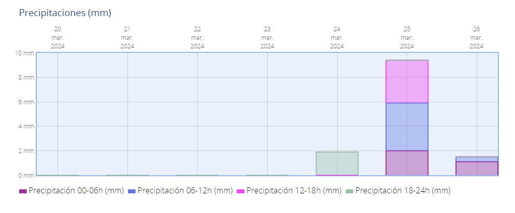 El Miércoles Santo apunta a dificultades desde las 11 de la mañana, que irán convirtiéndose en casi una constancia real de chaparrones a partir de las 17 horas. Para ese entonces, la probabilidad es del 90%. En la noche, se esperan casi 1,7 litros de lluvia por metro cuadrado, manteniéndose el riesgo hasta bien entrada la madrugada. Irá acompañado de viento fuerte, razón por la cual el Ayuntamiento ha decidido cerrar los parques, debido a la alerta amarilla decretada por la Aemet.