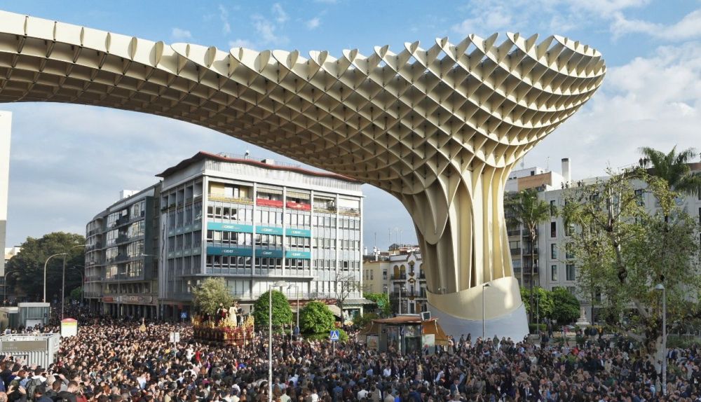 En calle Imagen, el Rocío de La Redención buscaba la Campana junto a las Setas -símbolo de Sevilla, signifique lo que signifique- trayendo la normalidad.