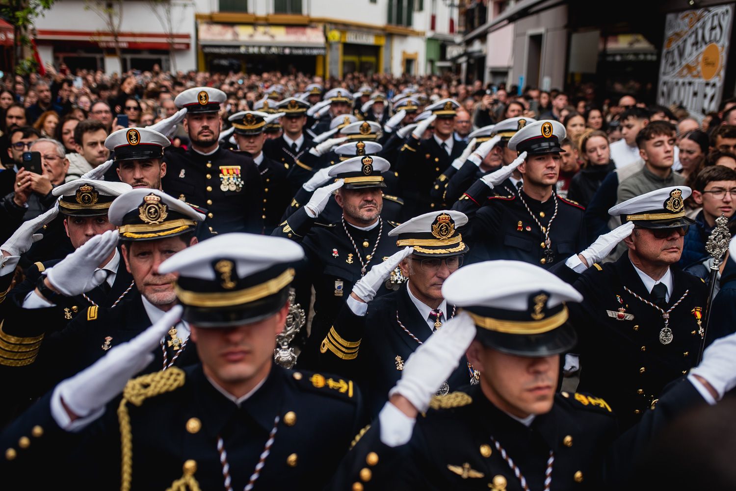 Una vez superada la puerta de la parroquia, la Armada se ha sumado al acompañamiento musical para interpretar la letra de esta conocida marcha. Para enteder todo esto hay que remontarse a los inicios de la Hermandad en 1982 y su estrecha vinculación con La Isla.