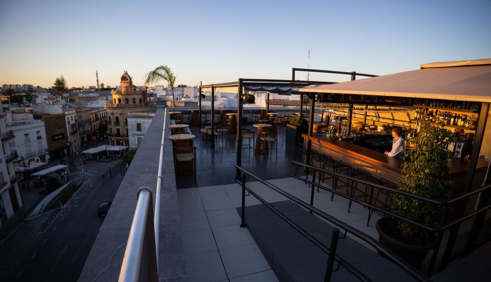 Nos detenemos en uno de esos inmuebles que han revivido gracias al impulso de esta modalidad de alojamiento. Es el que antes fue sede del IARA (Instituto Andaluz de Reforma Agraria) y sede que fue también de la delegación de Medio Ambiente del Ayuntamiento de Jerez, situado en la plaza Esteve. La empresa EsZentrico Suites gestiona 31 apartamentos turísticos y una azotea donde se ha instalado un bar, abierto al público en general, que está teniendo una interesante aceptación y que ofrece unas vistas inéditas de esa zona del centro a la vez que se disfruta de un espacio ‘chill out’.