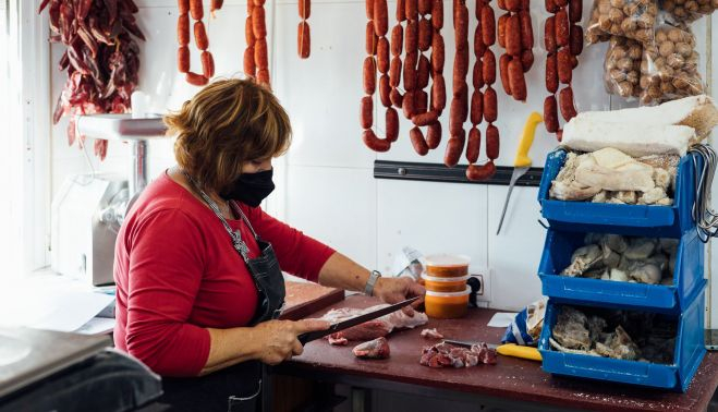 Vecinos y vecinas de distintas generaciones esperan en la puerta al sol, muchos con una lata de cerveza que cogen de la nevera que el establecimiento tiene en la entrada. Ella y todo su equipo, compuesto por miembros de su familia, no paran ni un segundo: manteca colorá, almuerzo campero de Vejer, albóndigas, hamburguesas y chuletones de retinto, chicharrones de Cádiz, chorizos, morcillas, butifarra, pollos camperos… cualquier producto que imagine, está presente en esta carnicería. 40 años lleva la familia Valdés dedicada al oficio y 24 Luisa al frente de esta carnicería.