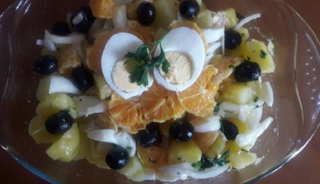 "Cocemos las patatas en abundante agua, se pueden cocer enteras con piel o directamente limpias y troceadas. Una vez tiernas las sacamos y dejamos enfriar un poco antes de pelarlas y trocearlas. Cocemos el bacalao, una vez cocinado y frio lo desmenuzamos un poco con las manos. Una vez que estén frías las patatas, limpiamos las cebolletas, la cortamos en tiras finas y reservamos. Quitamos los huesos a las aceitunas, pelamos las naranjas y las cortamos en gajos. Si le queremos añadir huevo cocido, lo cortamos en láminas no muy gordas. Por último, montamos la ensalada aliñándola con sal, zumo de limón o vinagre y aceite de oliva virgen extra".