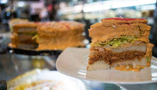 Es difícil encontrar a un sevillano que no haya probado las típicas tartas vegetales del Patio San Eloy. Lechuga, tomate, huevo duro, mayonesa, atún, zanahoria y maíz componen una creación que tiene tres décadas y que constituye uno de los platos estrella del local. "Empezamos a hacerlas con pan de molde y a la gente le gustó tanto que se encargó a un panadero que hiciera el pan redondo", relata César. Antes de la llegada de la pandemia, se vendían durante los fines de semana una veintena de tartas cada día. Y unos 2.500 montaditos, otra de las especialidades. También venden mucho jamón —unos 8.000 al año—, chacina ibérica y cerveza, mucha cerveza. Hasta 250.000 litros anuales.