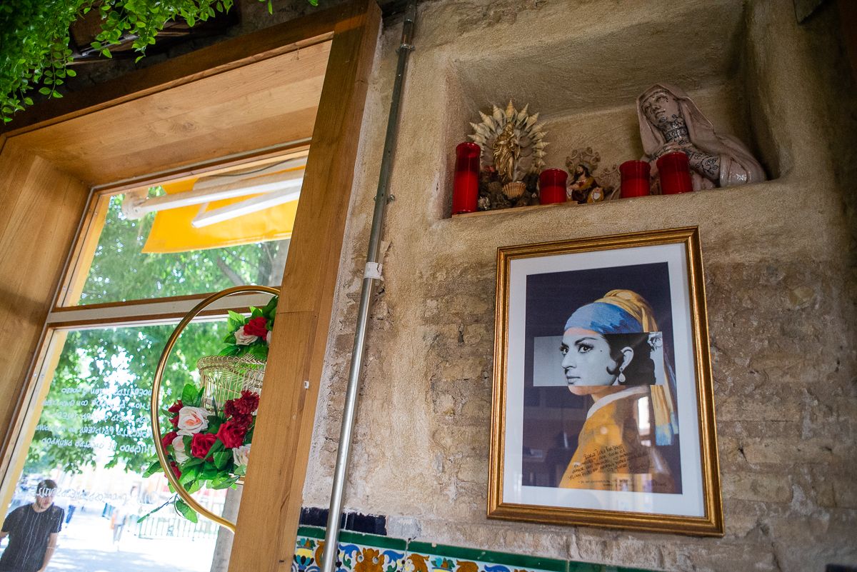 Según explica, la pandemia ha tenido algo que ver, “nos ha servido para hacer mejor las cosas y conseguir una mejor localización”. El local, un bar de los años 50, presenta ese toque “un poco canalla” que caracteriza a la firma con vírgenes impregnadas en porcelana o alguna que otra vela. Las vigas vistas brotan en su interior donde se descubrieron antiguos azulejos de mensaque de los años 20 debajo del pladur.