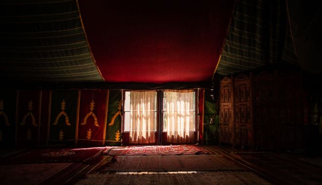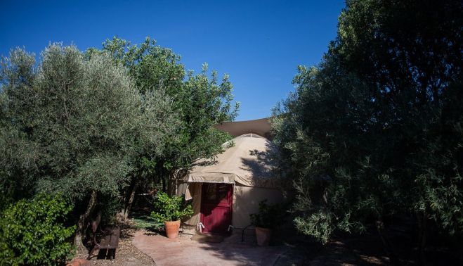 "La finca la diseñaron mis padres", dice Román. "Yo aparezco en 2017 cuando dicen que querían vender, y empiezo a adaptar el espacio como alojamiento rural". Primero en la choza, con capacidad para un máximo de seis personas, que imita la arquitectura típica de las gañanías que había en la campiña jerezana, donde residían jornaleros cerca de los cultivos que trabajaban. La yurta, de estilo mongol, imita a la utilizada por nómadas en Asia central, con una cama de matrimonio, chimenea y un amplio espacio a su alrededor. La jaima, colorida en su interior, está llena de alfombras. En ella se celebran sesiones de yoga o talleres de movimiento expresivo, entre otras cosas.