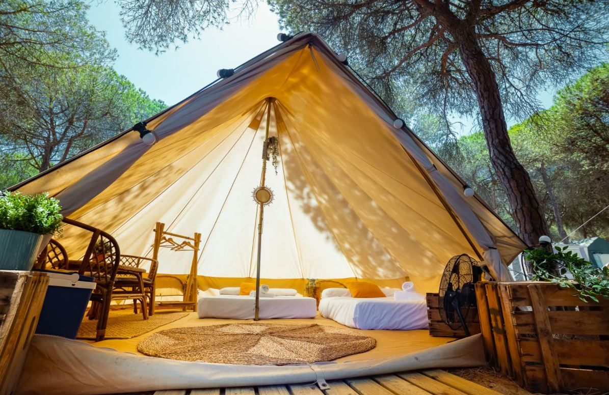 Ir de camping puede llegar a ser una odisea debido a la cantidad de equipaje que hay que preparar, y después acomodar en la parcela. Bajo el lema “déjate de líos”, la empresa Kampaoh ofrece un nuevo concepto de acampar con amplias tiendas glamourosas que presentan todas las comodidades de un hotel en un entorno natural. Servicio de limpieza, menaje, camas, iluminación eléctrica, nevera portátil. Todo ello en una cabaña tipo jaima decorada, con una capacidad de hasta ocho personas, que combina el confort con la aventura de un camping. La empresa oferta sus habitaciones dentro de las instalaciones de los campings como una alternativa para toda la familia. Kampaoh ya ha echado sus raíces en Tarifa, El Palmar, Los Caños, Barbate o El Puerto, entre otros.