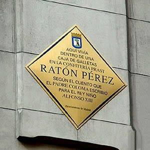 Huntley and Palmers para protegerlas de las hormigas blancas, término con el que se denominaba a las termitas.El Ratón Pérez vivía felizmente con su esposa, dos hijas y un hijo en esta caja de galletas situada en la calle Arenal 8, donde se ubicaba la Pastelería Prast, de nuevo un elemento real dentro del relato de fantasía. Actualmente una placa conmemora en esta calle madrileña la residencia del personaje ilustre del Ratón Pérez, única concedida a un personaje imaginario y que comparte el honor con otras placas conmemorativas repartidas por la ciudad dedicadas a personajes de la envergadura de Andersen o Plácido Domingo, entre otros.