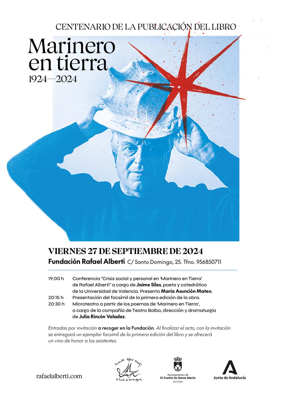 El próximo 27 de septiembre, la Fundación abrirá su programación conmemorando el centenario de la primera obra del poeta portuense "Marinero en Tierra". El acto contará con la presencia del poeta y catedrático de la Universidad de Valencia, Jaime Siles, que impartirá una conferencia con el título "Crisis social y personal en Marinero en Tierra", que será presentado por la escritora y viuda del poeta, María Asunción Mateo. Tras la conferencia se dará paso a la presentación de una edición facsímil del libro "Marinero en tierra", que será entregado al público asistente al finalizar la misma. El acto se cerrará con la puesta en escena y dramatización de algunos poemas del libro, a cargo del grupo de Teatro Balbo.