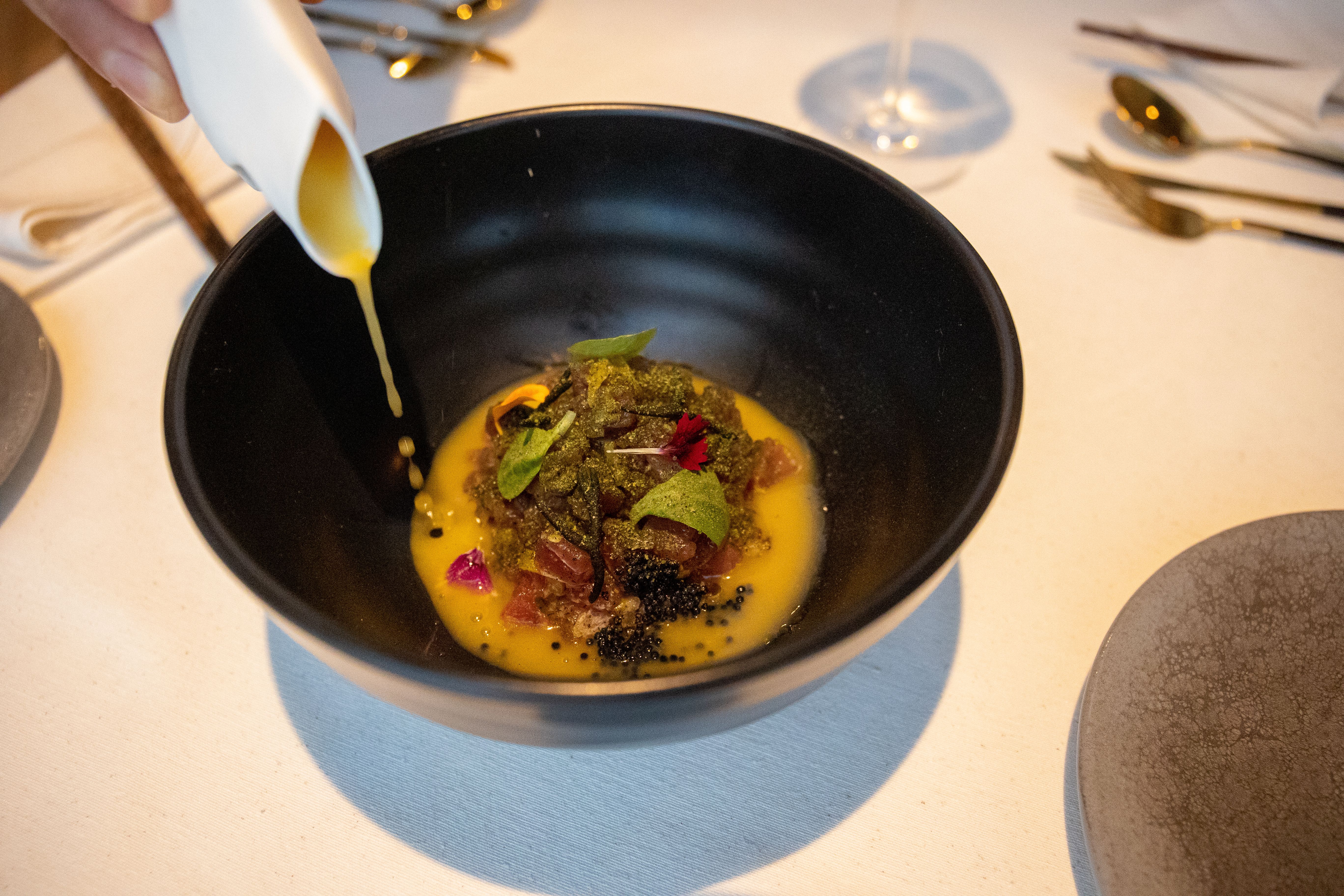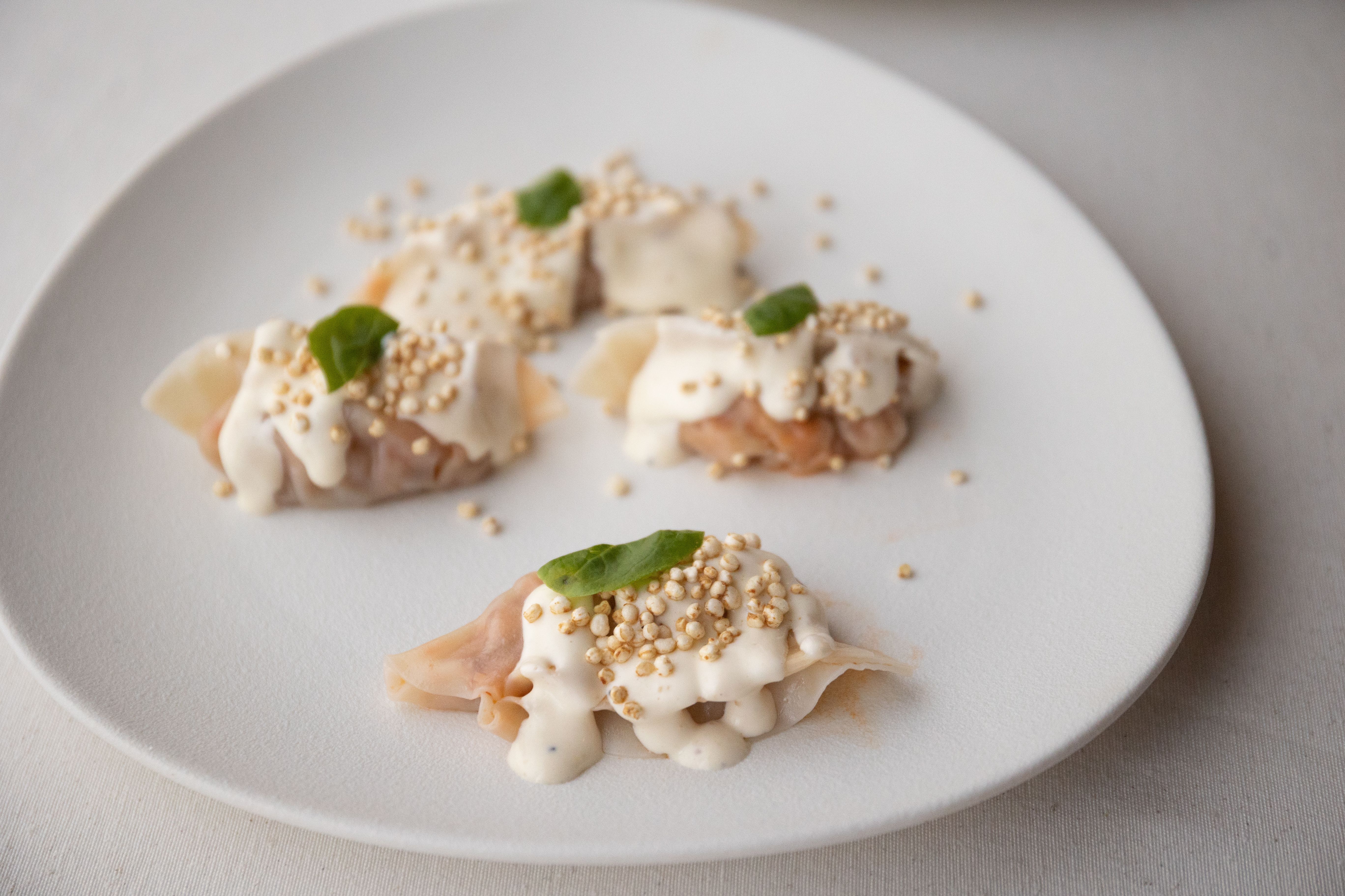 "Digamos que entre trabajar con muchos comensales y luego pasar a tener nuestra propia cocina fantasma —en pandemia crearon un delivery de comida japonesa para trabajar sirviendo solo a domicilio— hemos encontrado un punto en el que para nosotros tener cinco mesas —16 comensales; por ahora, solo cenas de miércoles a domingo— es estar llenos. Y no queremos más, lo que queremos es cuidar todos los detalles de cada plato y que toda salga perfecto", explica Jaime, que lleva la voz cantante del dúo y que, aparte de trabajar una temporada en Aponiente —"es el mejor máster que puedes tener"—, es dueño de una distribuidora de productos asiáticos que trabaja principalmente en la provincia de Cádiz.