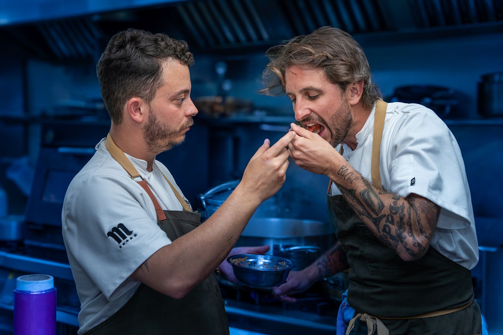 "El primer contacto con la cocina creativa", admite, llegó en Neo, en Madrid. Luego pasó por cocinas de gente tan grande como Berasategui, Arola y Eneko Atxa, con meses intermedios en Londres, en Brasil, en Galicia. La gente de mar, siempre yendo y viniendo, ida y vuelta. Antes de cumplir los 24 años ya era jefe de cocinas con muchos integrantes.