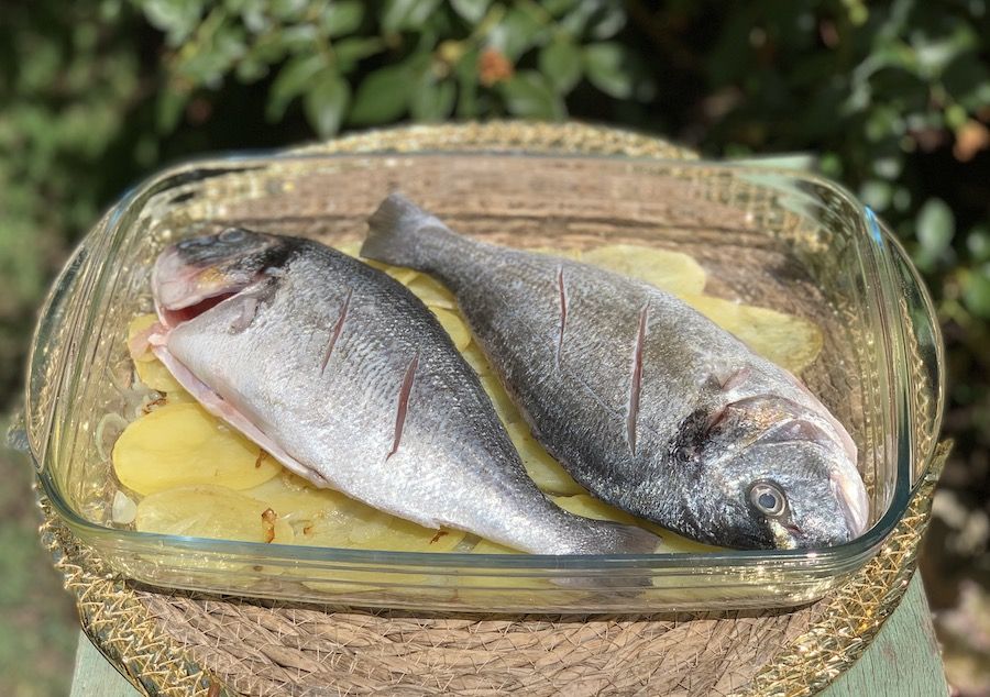 Preparamos las doradas (le pedimos a nuestro pescadero de confianza que lo limpie de escamas y tripas). Le hacemos unos cortes transversales, las salpimentamos y le agregamos el zumo de un limón, extendiéndolo bien por todo el pescado. Las colocamos encima de las patatas cocinadas al horno.