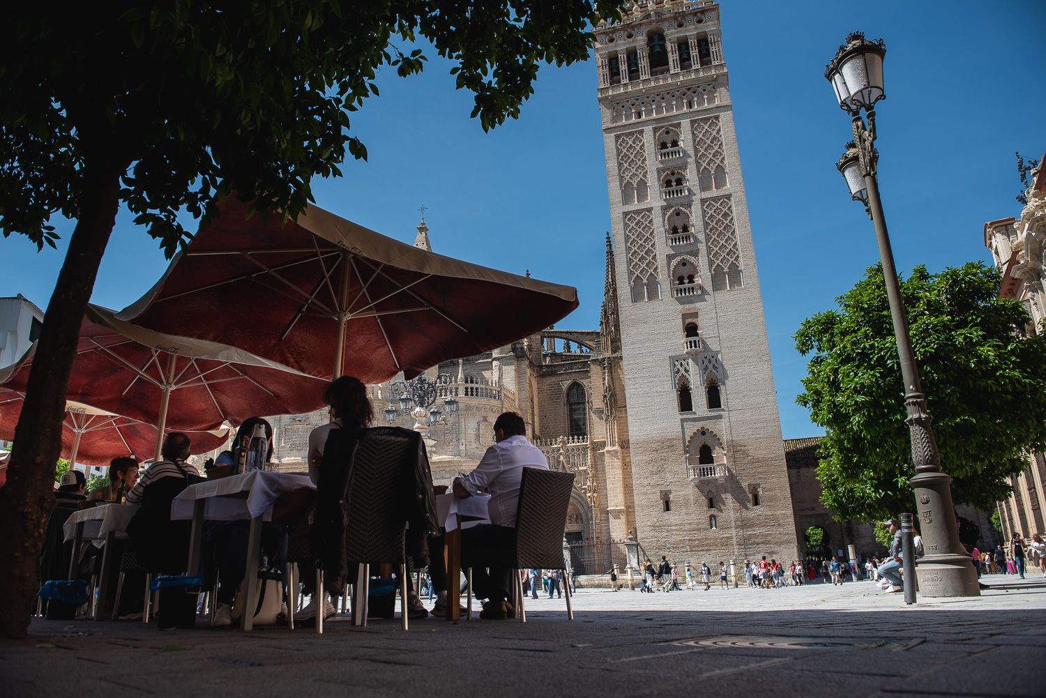 Las terrazas de la calle Mateos Gago permiten también la contemplación, desde abajo, de la Giralda y de esa encantadora calle moteada de naranjos, aunque probablemente sea uno de los centros neurálgicos de ese aparente problema que se ha suscitado en la ciudad en los últimos tiempos entre público local y masificación turística.