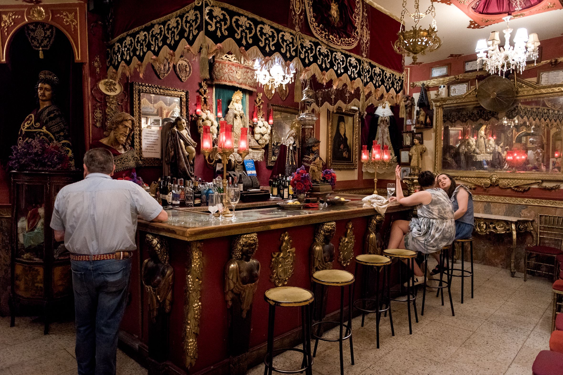 Cuando uno pisa este singular bar, tiene dudas del motivo que ha provocado la visita. No queda claro si es para tomarse algo, para rezar o, simplemente, para disfrutar del arte. Su dueño lo tiene más claro. "Es para tomarse algo, un Agua de Sevilla o la Sangre de Cristo". Estos son los nombres que tienen los principales cócteles. El segundo de ellos se llamaba Garlochí, sin embargo, la cantante Madonna hizo que cambiara el nombre. En 1993 protagonizó un reportaje titulado 'Sangre de Cristo', algo que hizo pensar a Miguel Fragoso.