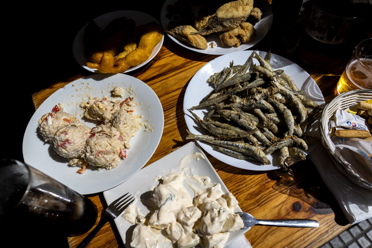 Dentro de la carta, estos kioskos ofrecen tapas frías como las papas aliñadas o con alioli, las huevas o la ensaladilla, pero la gran estrella es el pescado. "Tenemos merluza rebozada, cazón en adobo, puntillitas... la oferta es amplia y, realmente, todo lo que cocinamos se vende muy bien", sentencia José María.
