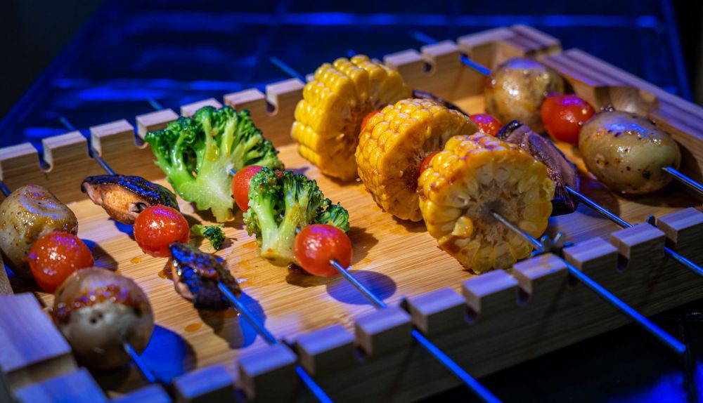 Cada mesa, cuenta con su propia barbacoa eléctrica donde los clientes podrán hacerse ellos mismos hasta veinte tipos de brochetas como, por ejemplo, de lengua de ternera, mollejas de cerdo, pollo yakitori, gambones, maíz o brócoli y tomate. “La intención es que el cliente se ponga solo la brocheta. Nosotros le enseñaremos cómo tiene que ponerla, a qué temperatura y se van haciendo y las van comiendo”. Pero hay muchas más sorpresas. “Los clientes pueden empezar con una ensalada de cristal de pollo coreano con huevo de dragón o un oi muchín de salmón marinado con miyeok y sésamo o, si prefieren, un entrante caliente tenemos el taiwan hot corn, que es una salchicha tailandesa rebozada en panko y chettos que seguro que va a hacer las delicias del público más joven”.