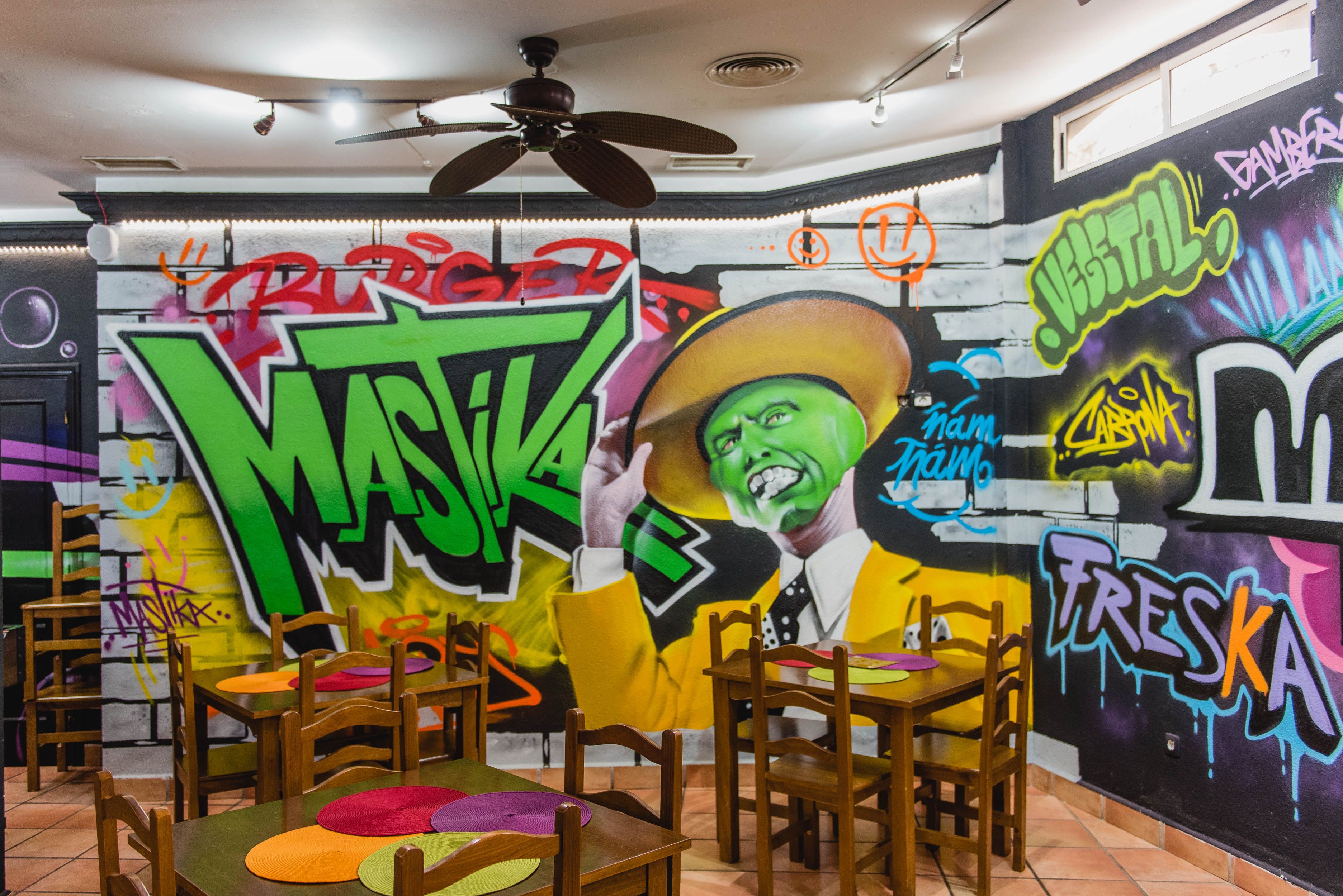 El espacio tipo caserío que ocupaba El Salmorejo, con sus aperos de labranza, sus soportes de madera para botellas de vino, sus manteles de cuadros, se ha transformado en un espacio urbano, las paredes, por obra y gracia de los diseños grafiteros de Sarko y Harfo, son ahora lienzos coloristas que muestran grafismos del streat art y personajes por todos conocidos del cine y la animación televisiva en multicolores murales. El cambio se hizo el pasado septiembre y, desde entonces, Mastika saca un buen número de hamburguesas y pizzas artesanas de su cocina a diario para un público, como nos detalla Fede, de todas las edades.
