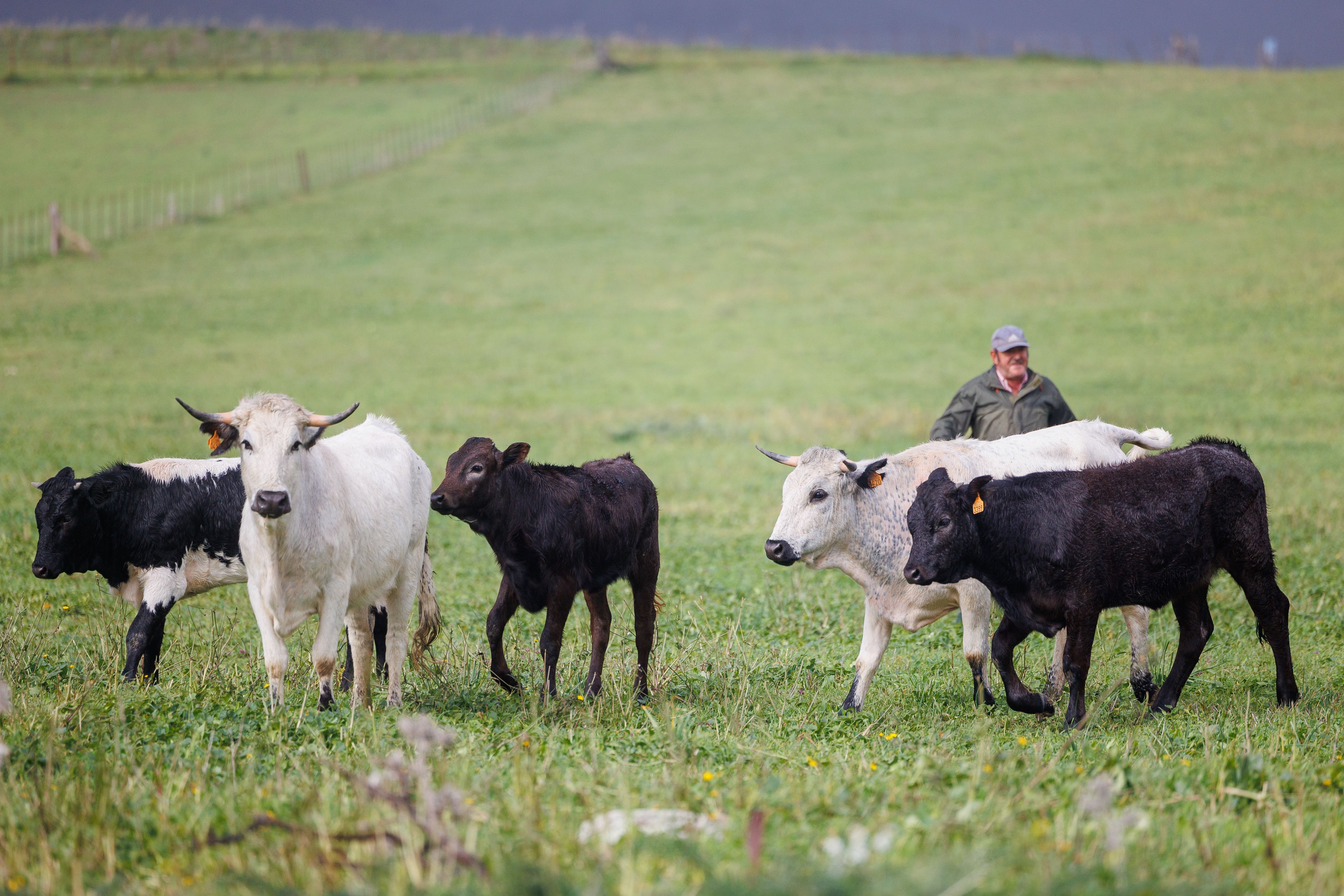 El pastor va a buscar a lo lejos a las vacas, controla "unas 75 en este momento, en esta temporada". Desaparece del campo de visión y luego aparece rodeado por un grupo de animales que no dejan de vacilarse, de rozarse. "Se llevan todo el día comiendo y, cuando terminan, sólo quieren jugar".