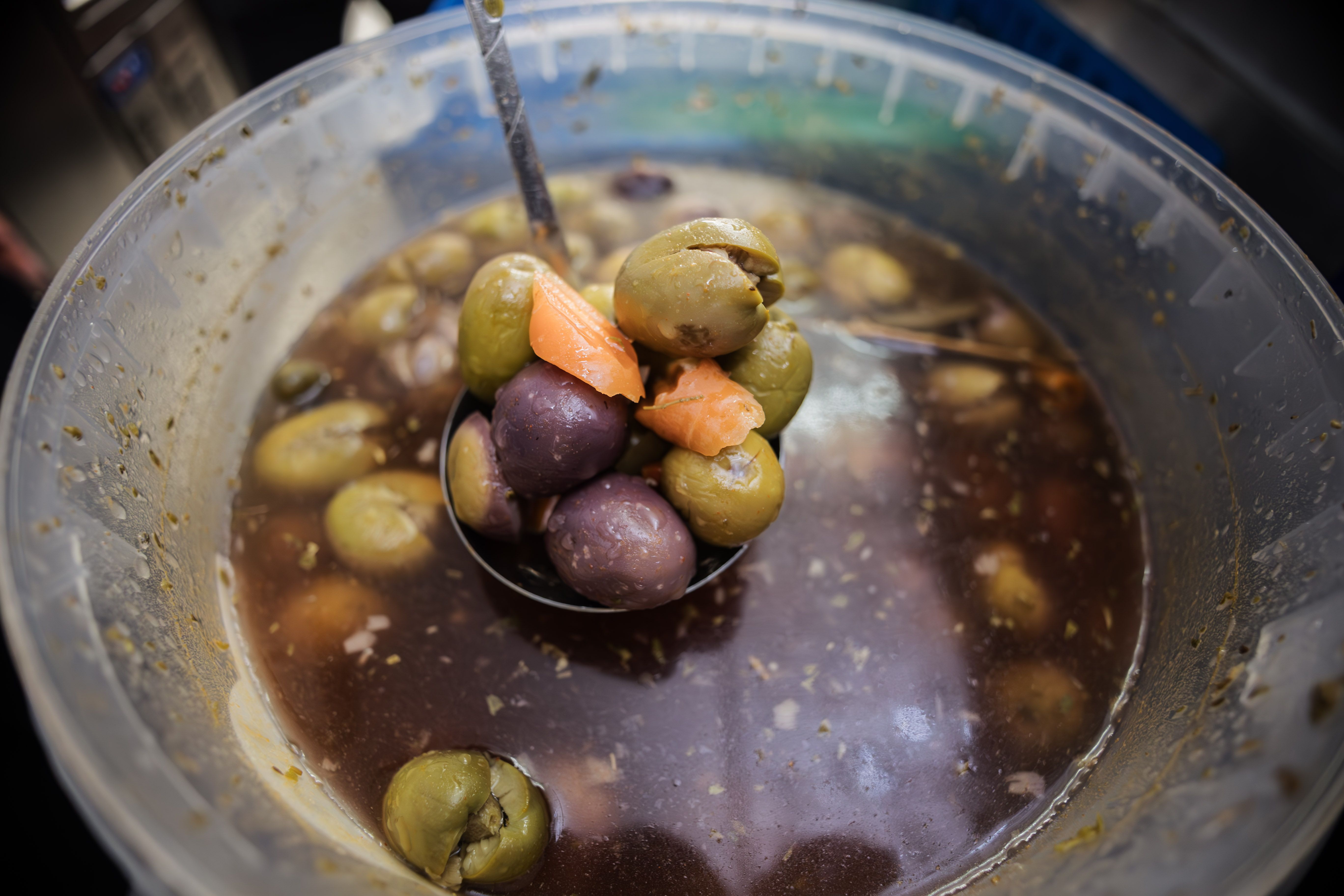 David Álamo abre todos los días a las 5 de la mañana y sirve muchos cafés, pero no es capaz de contabilizar los platillos de aceitunas que pone delante del cliente junto a su consumición. No las cobra, asegura que "tengo a la gente acostumbrada desde hace mucho tiempo y ahora no puedo echarme atrás". Lo cierto es que el precio de la aceituna, al menos este año, ha alcanzado un récord que pasará a la historia (entre 1,30 y 1,5 euros/kilo) por lo que comprarlas no es un gasto superfluo. Además, el empresario lleva más de un mes arreglando las variedades que compra, de una calidad excepcional, un trabajo que solo está pagado por la fama que adquiere la barra de su bar gracias a este aperitivo.