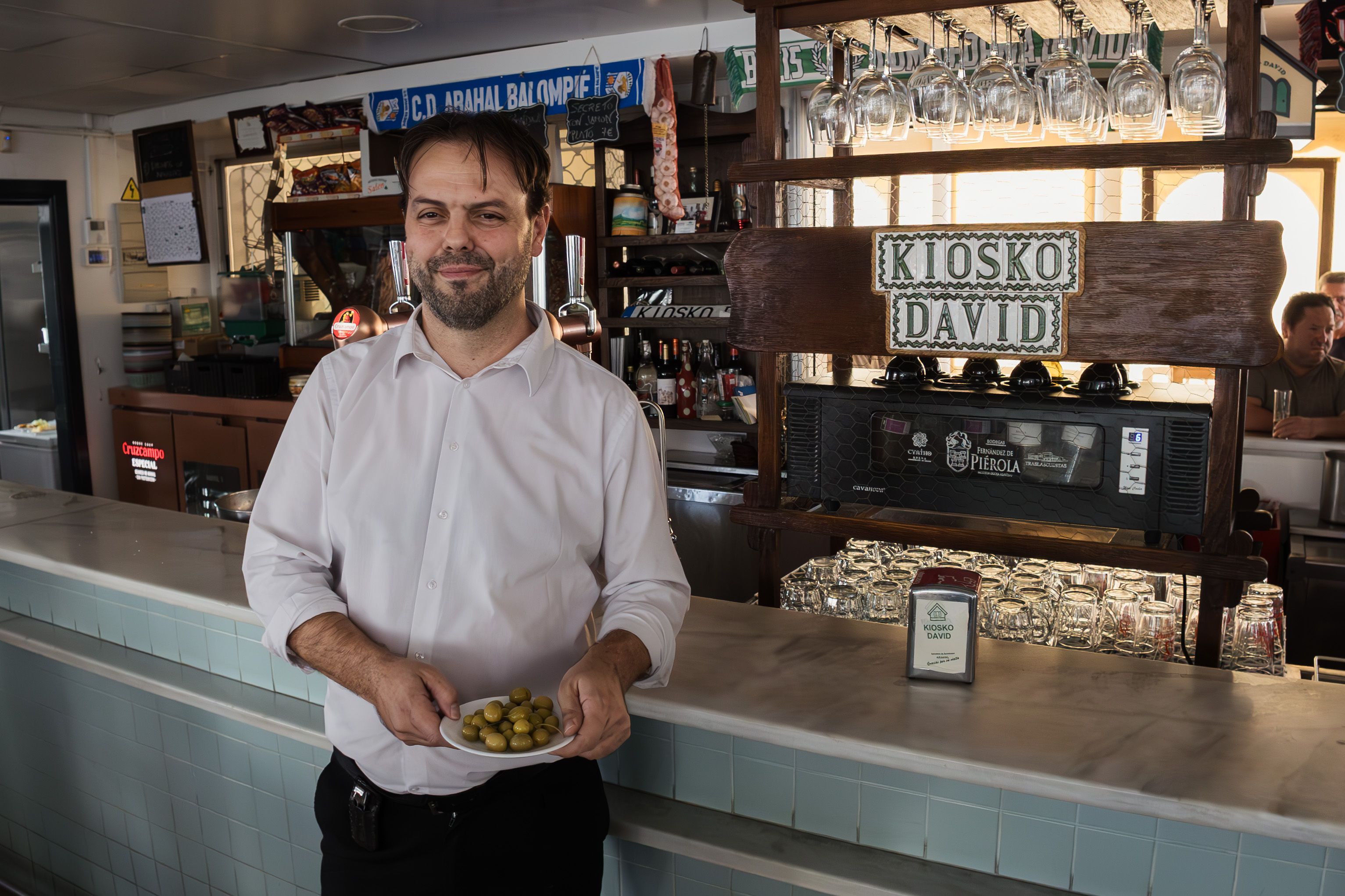 Es el caso de David Álamo, el propietario del primer bar que encuentras si accedes al pueblo por la segunda entrada de la A-92, la que lleva también a Morón de la Frontera. El establecimiento es, a su vez, apeadero de autobuses, por lo que supone una parada obligada para el visitante, sobre todo, si quieres probar aceitunas que hace apenas una semana aún estaban arracimadas en cualquier olivo de un pago de Arahal.